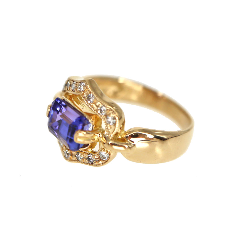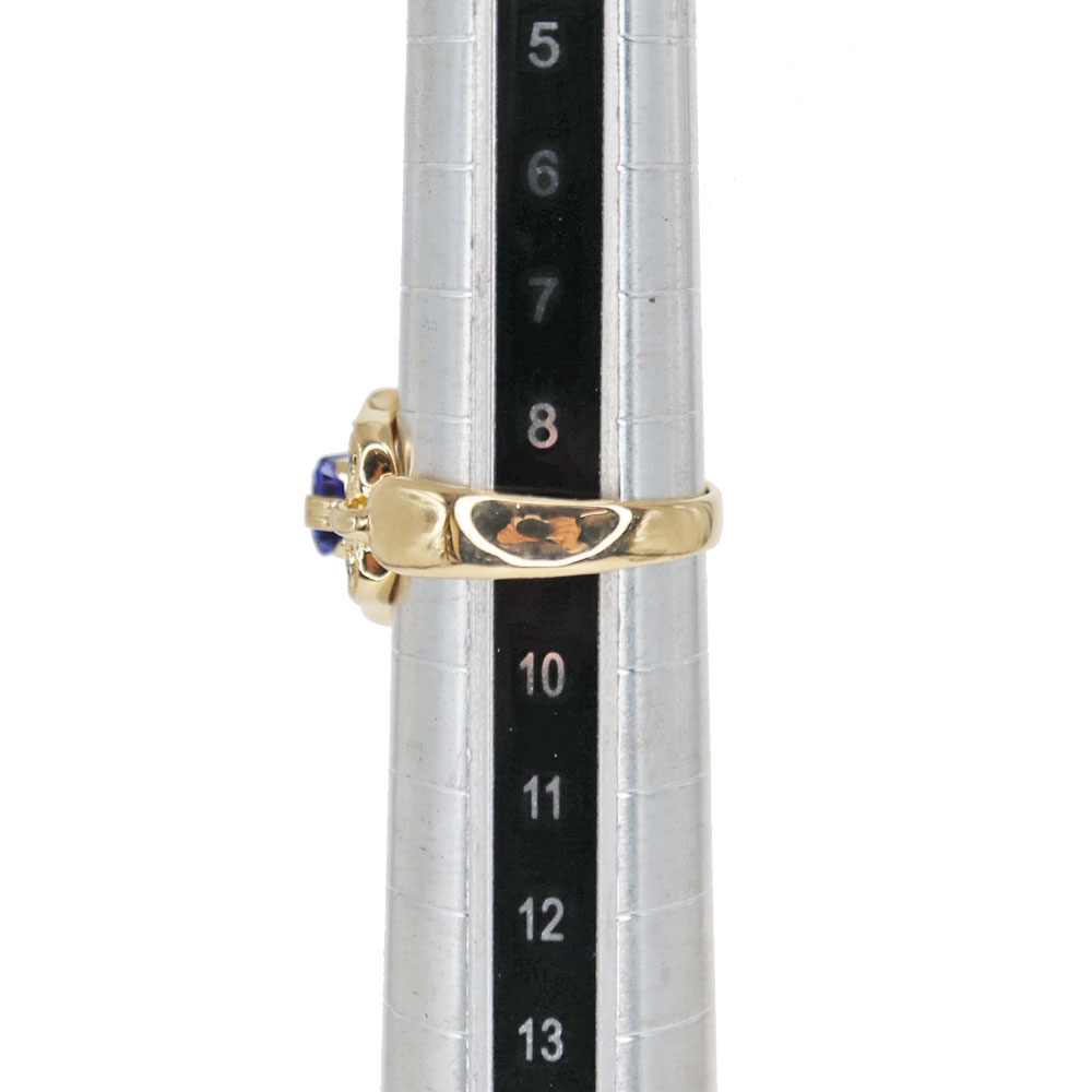 周囲には繊細に配されたダイヤモンド(計0.14ct)が輝きを添え、クラシカルでありながら華やかさのあるデザインに仕上がっています。 K18ゴールドの温かみのある色合いが、タンザナイトの神秘的なブルーを一層引き立て、お手元をエレガントに演出します。