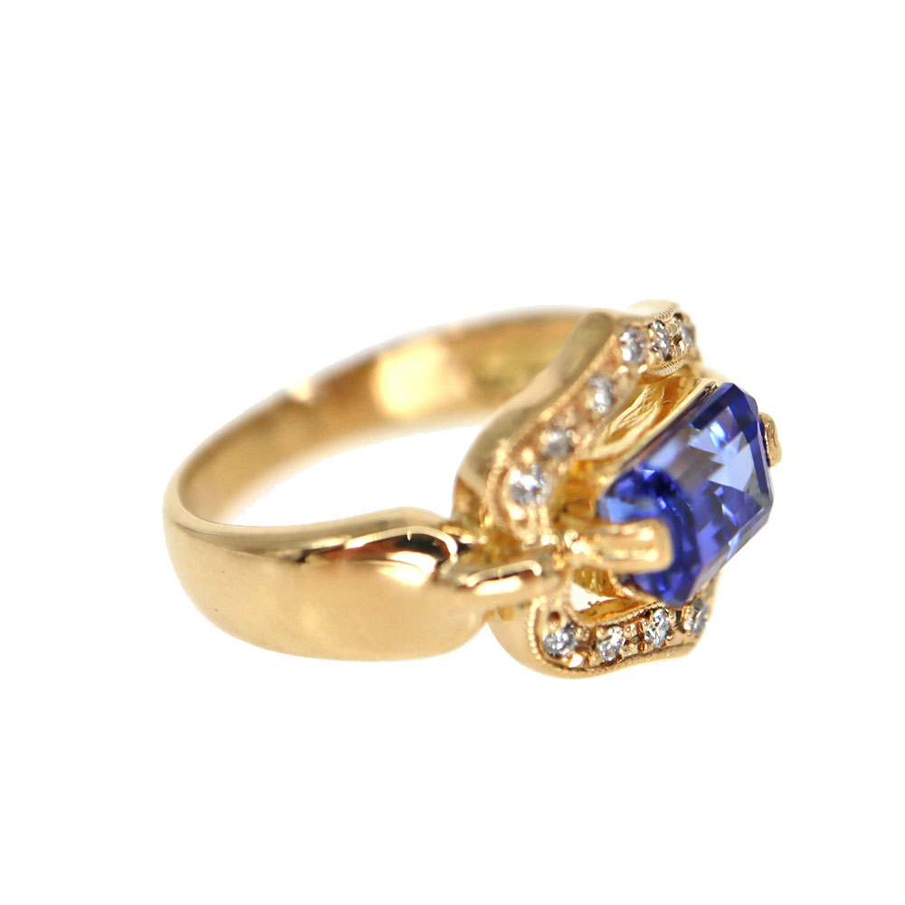 深みのある青紫色が魅力のタンザナイトを、存在感のあるスクエアカットでセッティングした上品なリングです。 1.37ctのタンザナイトは透明感が高く、角度によって表情を変える美しい色彩をお楽しみいただけます。