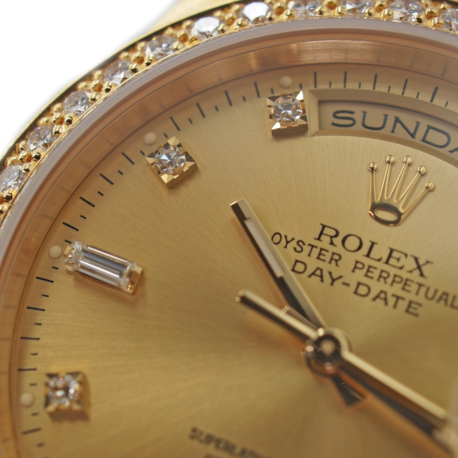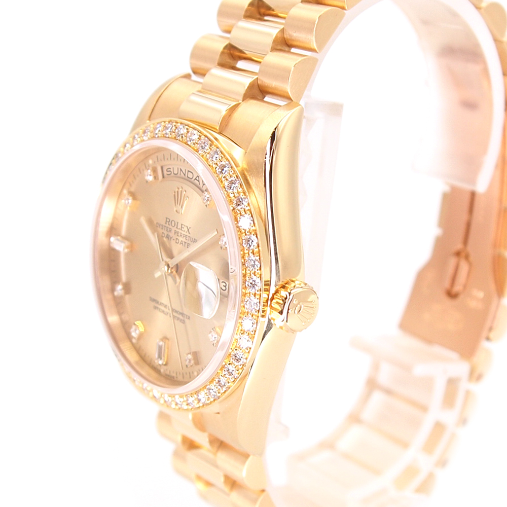 | 仕様 | 自動巻き キャリバー:Cal.3155 パワーリザーブ:48時間 精度:±0~+5秒/日 防水:100m防水 日付表示・曜日表示・ダイヤベゼル・8Pラウンド・2Pバゲットダイヤ・旧ダイヤ |