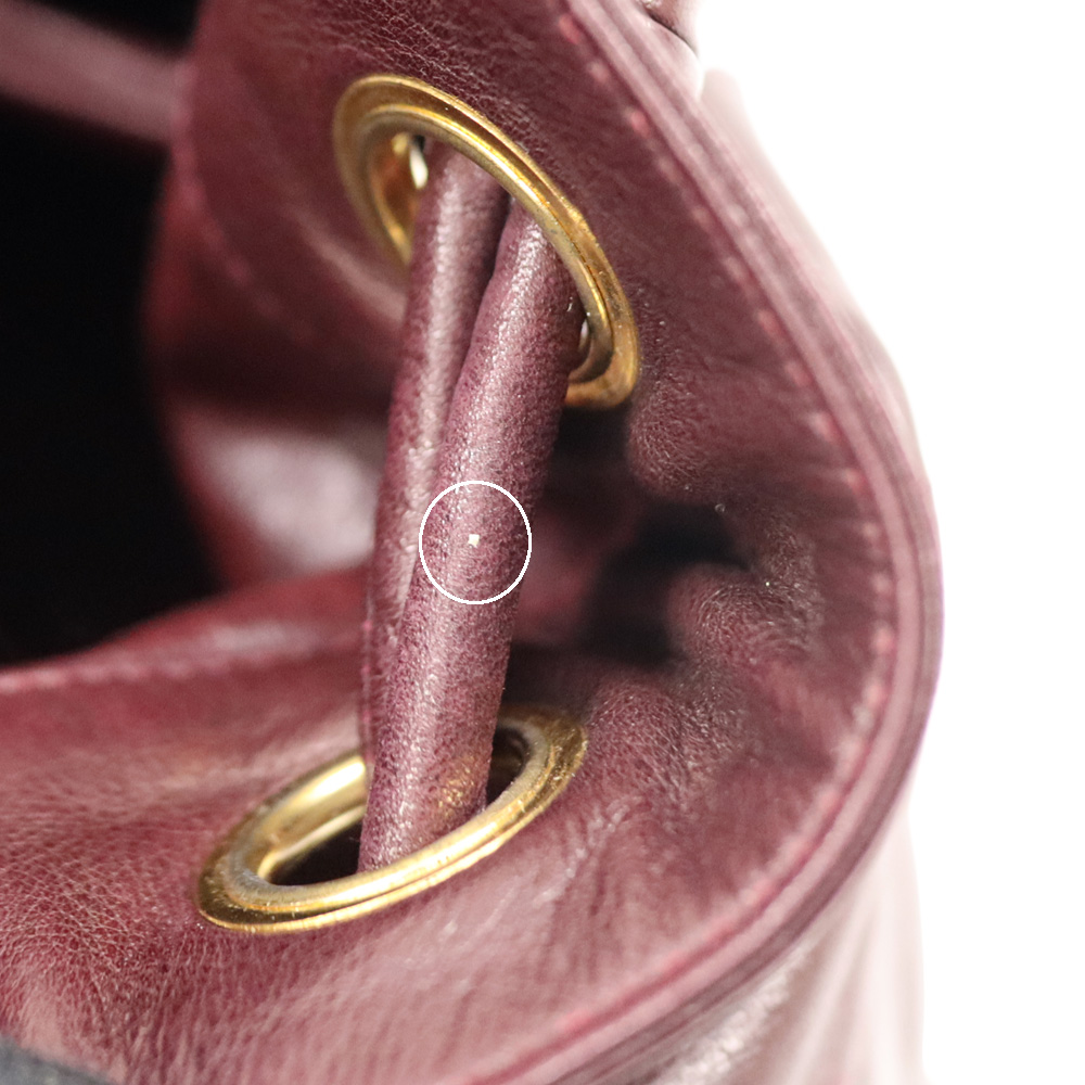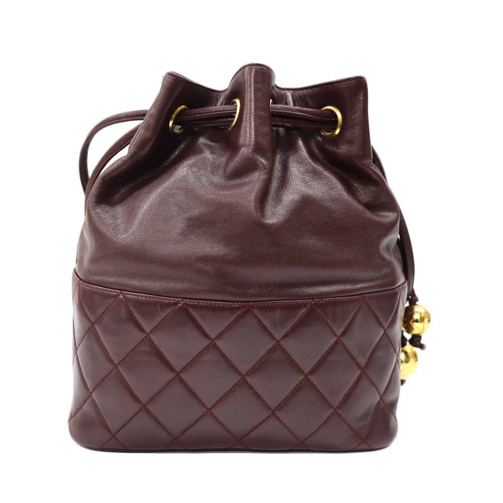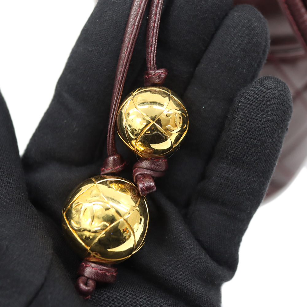 全面に使用されたボルドーカラーが目を惹くバッグです。 開閉用のひもにはココマークがデザインされた金具がついており、シャネルらしいデザインとなっております。 巾着開閉式のため、開けやすく普段使いにおすすめです。 お探しの方はこの機会にぜひいかがでしょうか。