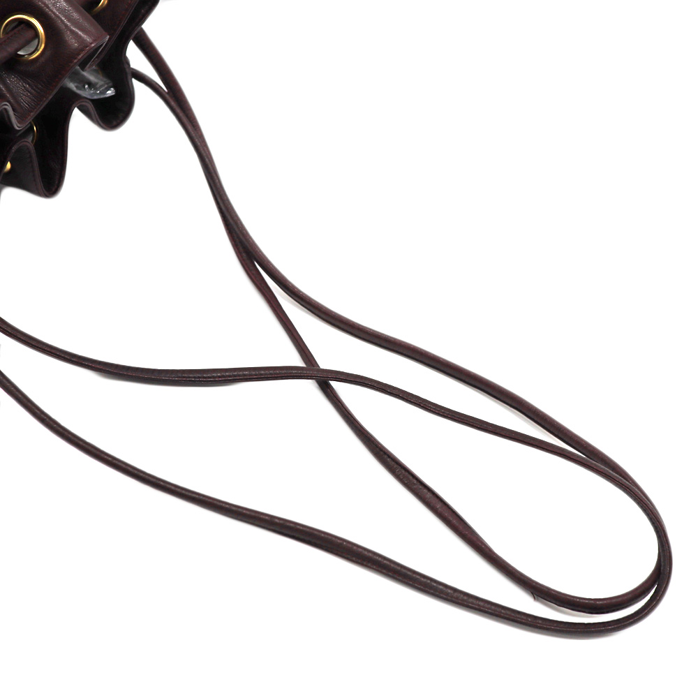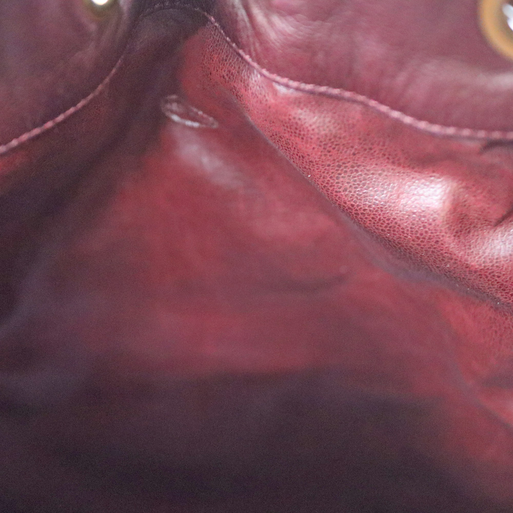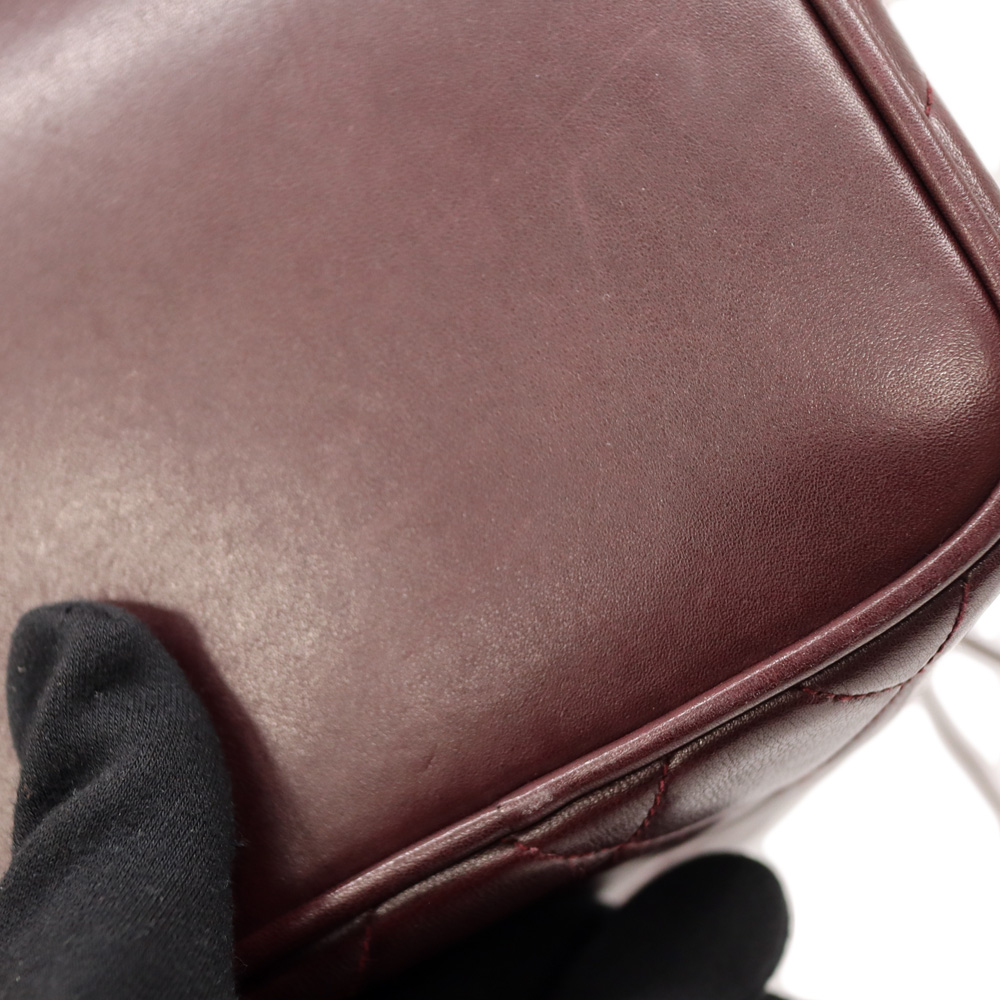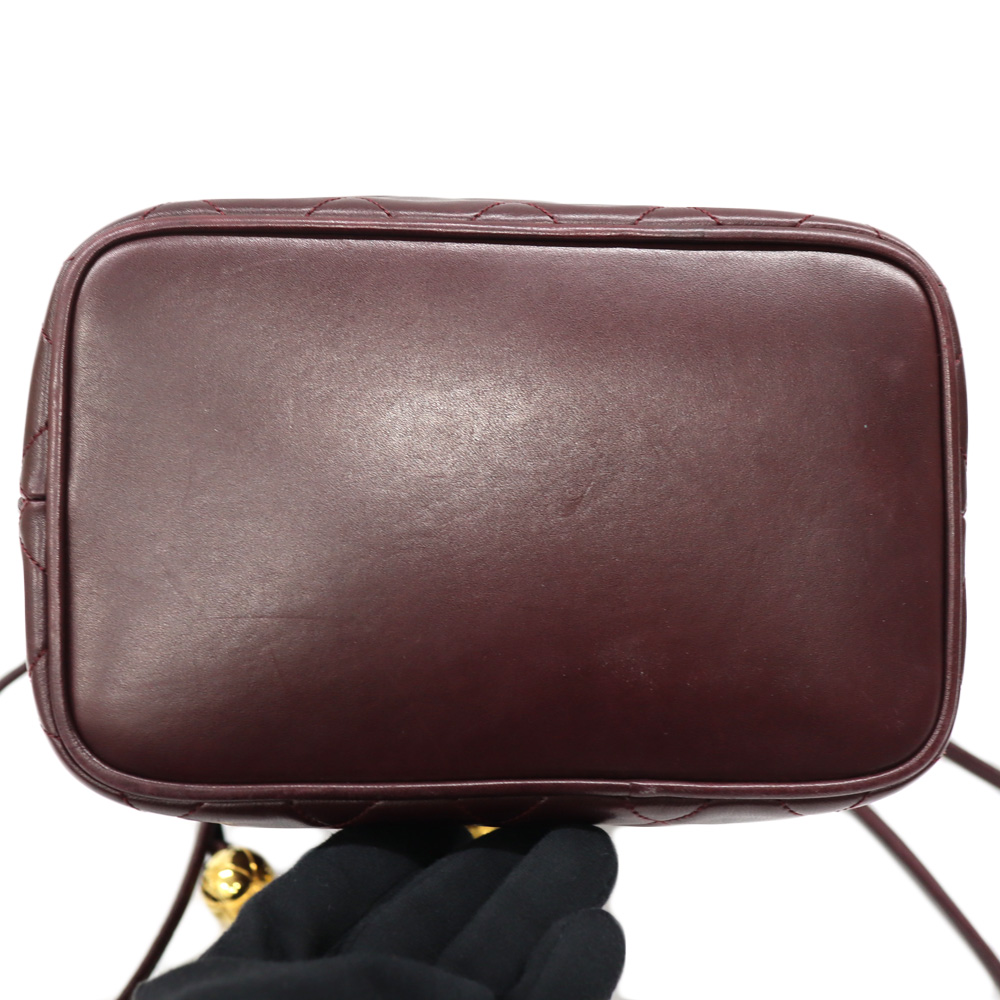 全面に使用されたボルドーカラーが目を惹くバッグです。 開閉用のひもにはココマークがデザインされた金具がついており、シャネルらしいデザインとなっております。 巾着開閉式のため、開けやすく普段使いにおすすめです。 お探しの方はこの機会にぜひいかがでしょうか。
