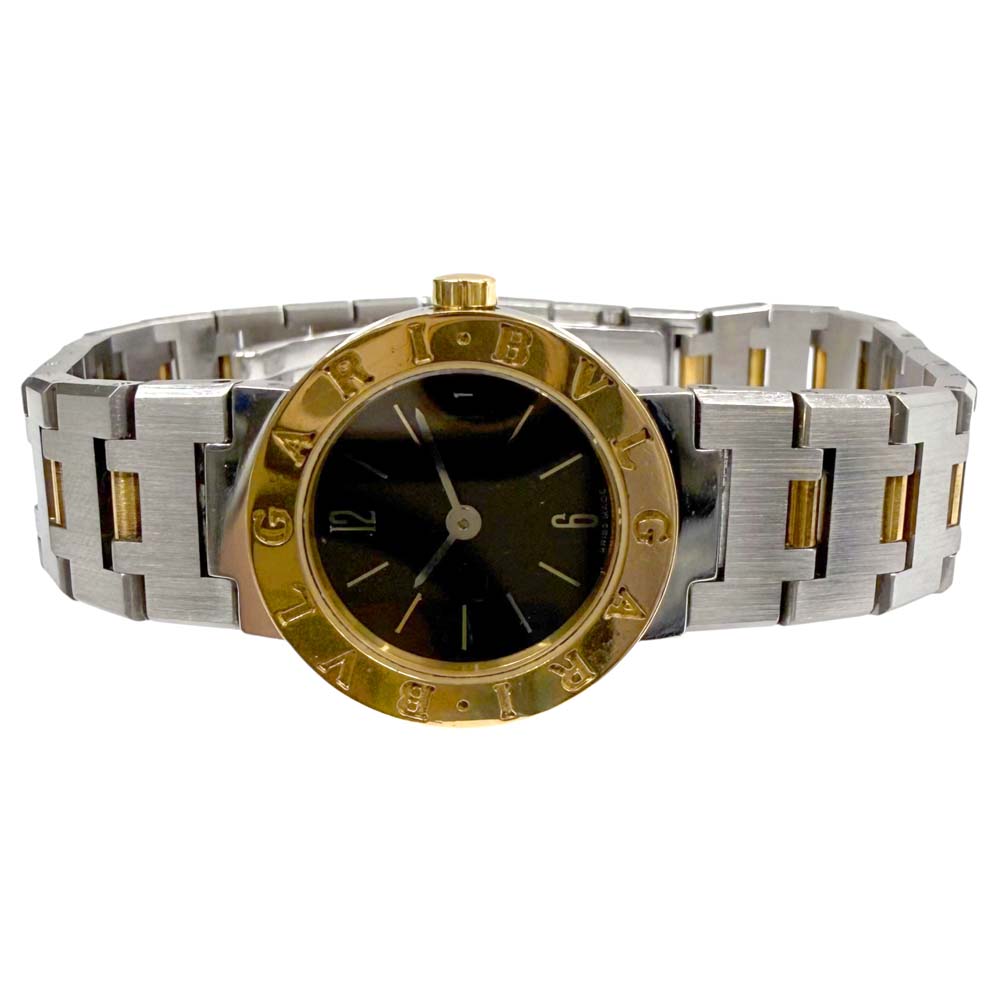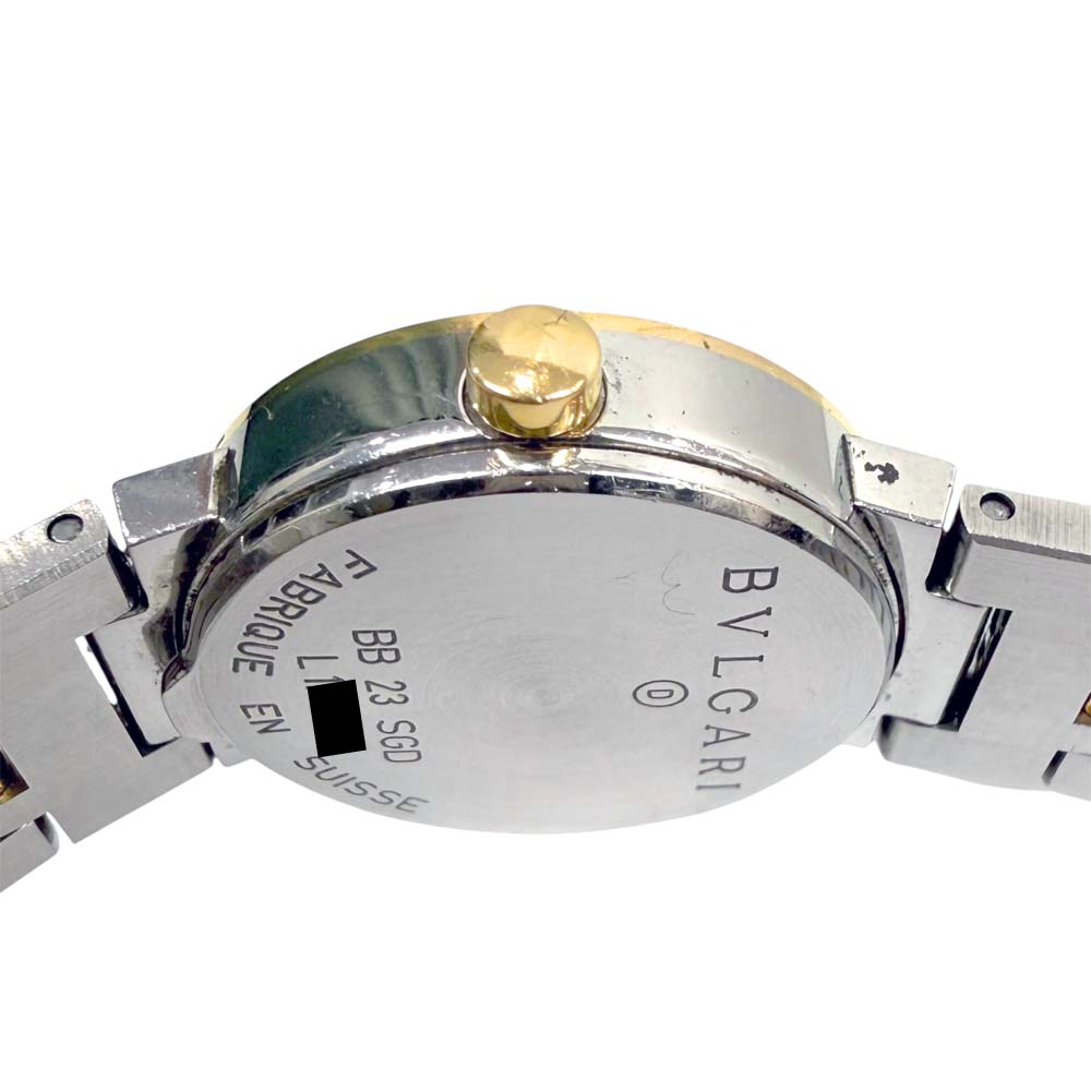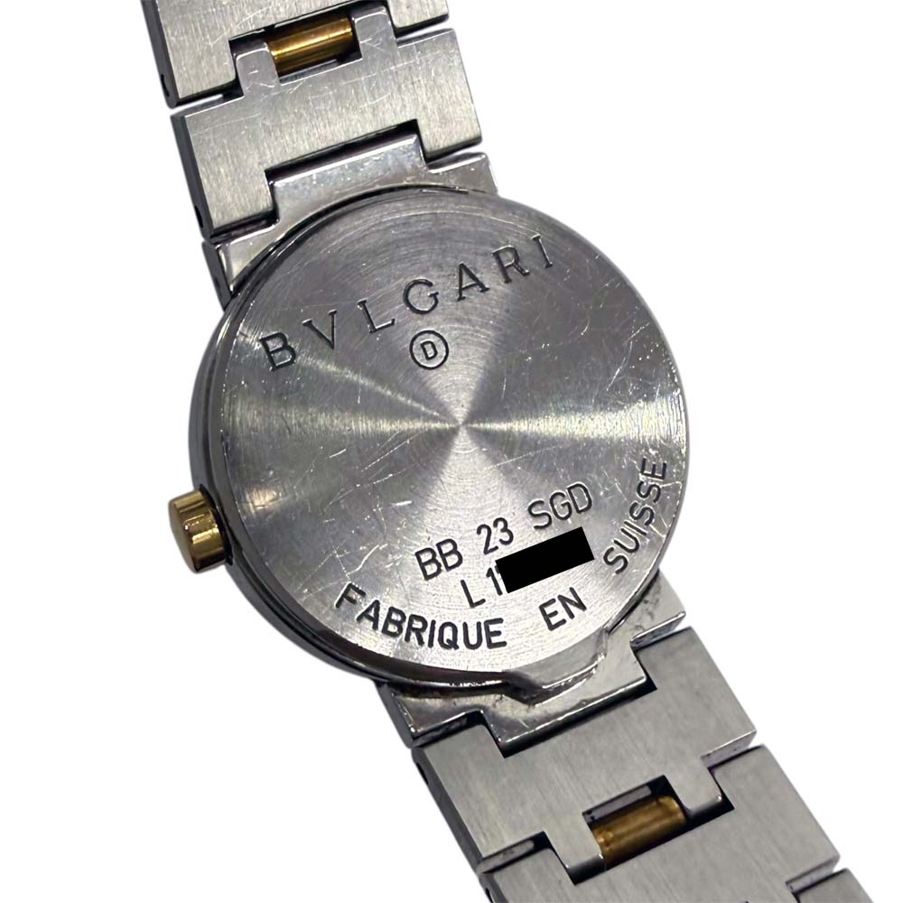 | 商品説明 | ブルガリのBB 23 SGD、通称「ブルガリブルガリ」は、エレガントなデザインが特徴の腕時計です。ケースはゴールドとステンレススティールのコンビネーションで、ラグジュアリーな印象を醸し出しています。文字盤にはブランド名が刻まれており、シンプルながらも高級感があります。クォーツムーブメントを搭載しており、信頼性のある精度を保ちます。ベゼル部分には「BVLGARI BVLGARI」と刻印されているデザインが、ブランドのアイコニックなスタイルを強調しています。