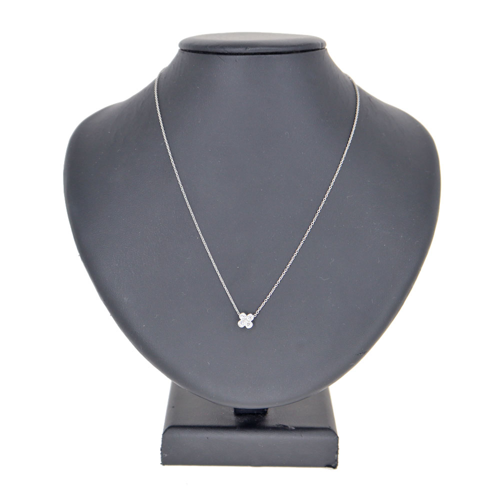 4つのダイヤモンドが花のようなモチーフになっているネックレスです。 控えめなサイズ感で、オン・オフ関係なくお使い頂けるデザインなので、使いやすいアイテムです。 キラキラと輝くダイヤモンドが首元を華やかにしてくれます。