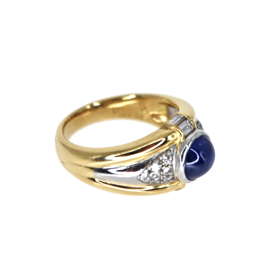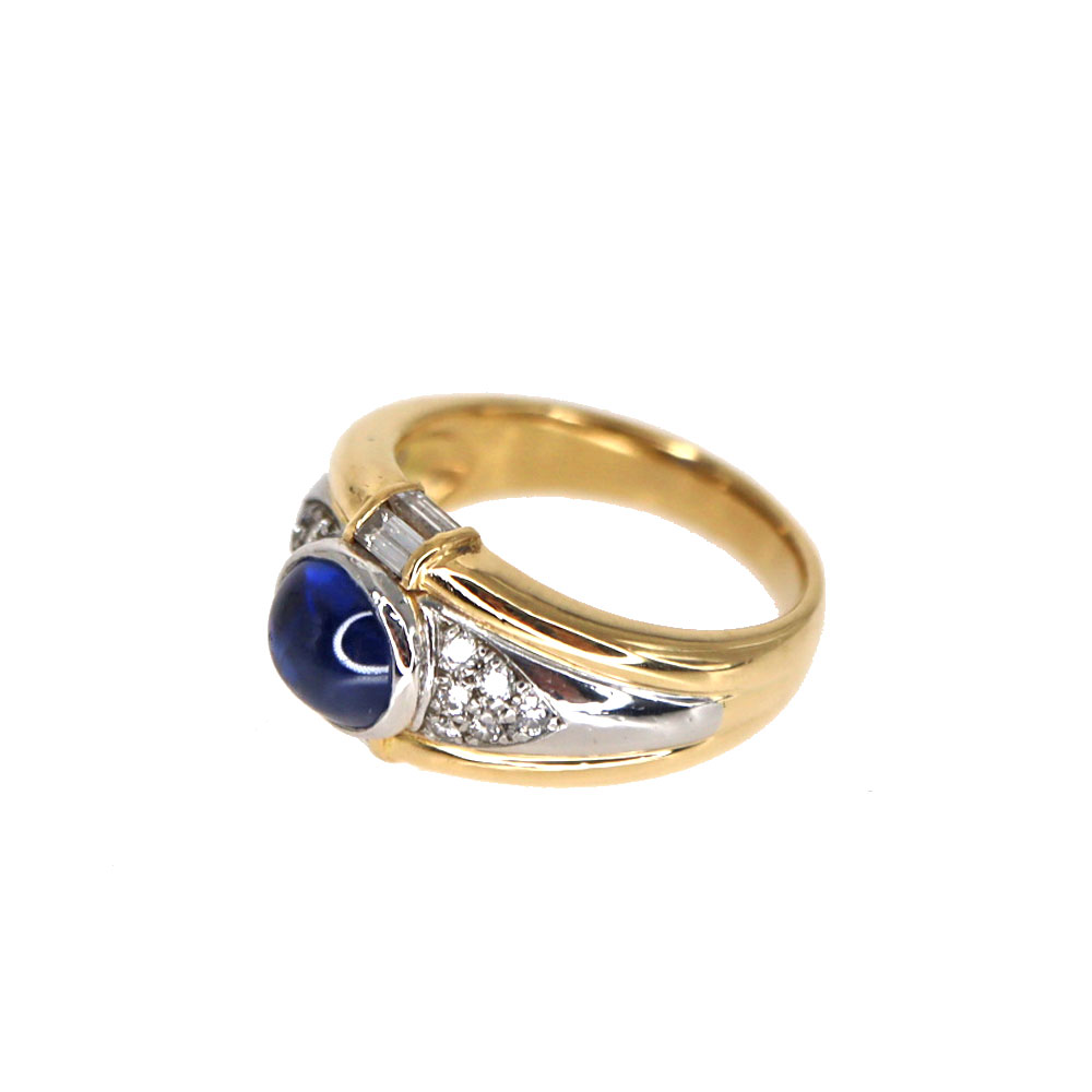 中央にサファイアがセッティングされたデザインが特徴です。 サファイアを囲むようにセッティングされたダイヤモンドが美しい輝きを放ちます。 ゴールドの華やかさと、プラチナの上品さを兼ね備えた指輪です。