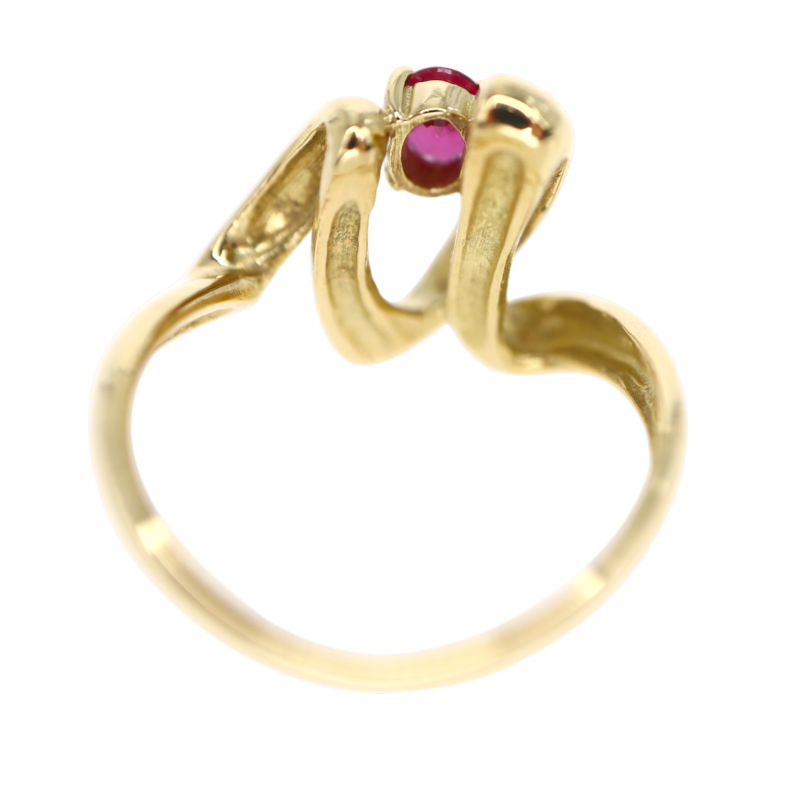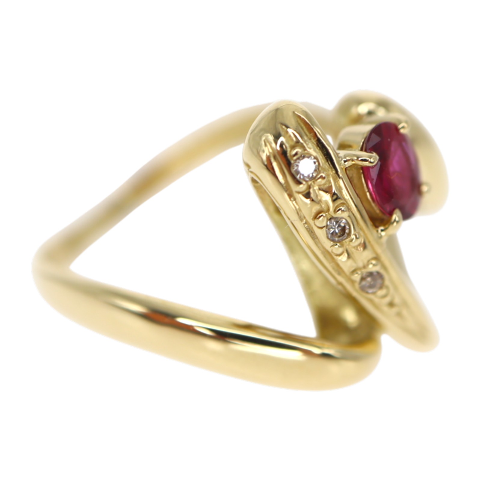 個性的なデザインに一粒のルビーが輝く指輪です。小ぶりな3粒のダイヤモンドもセッティングされているので、控えめながらも上品さがあります。