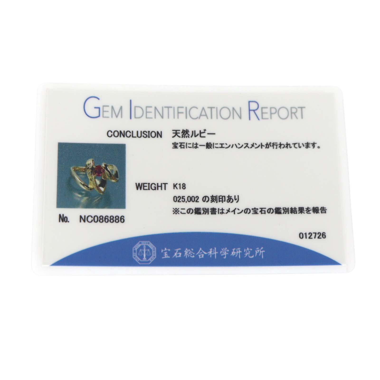 | 重さ | 総重量約:3.5g ルビー:0.25ct ダイヤモンド:0.02ct |