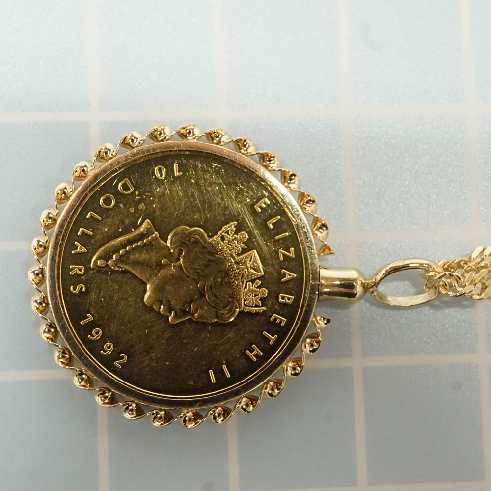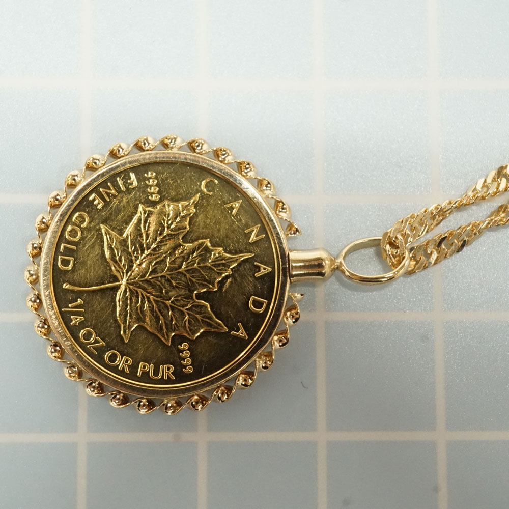 1/4ozのメイプルリーフコインがついたネックレスです。 長さやチェーンのデザインから女性が着用して頂いても問題ありません。 首元のアクセントにいかがでしょうか。