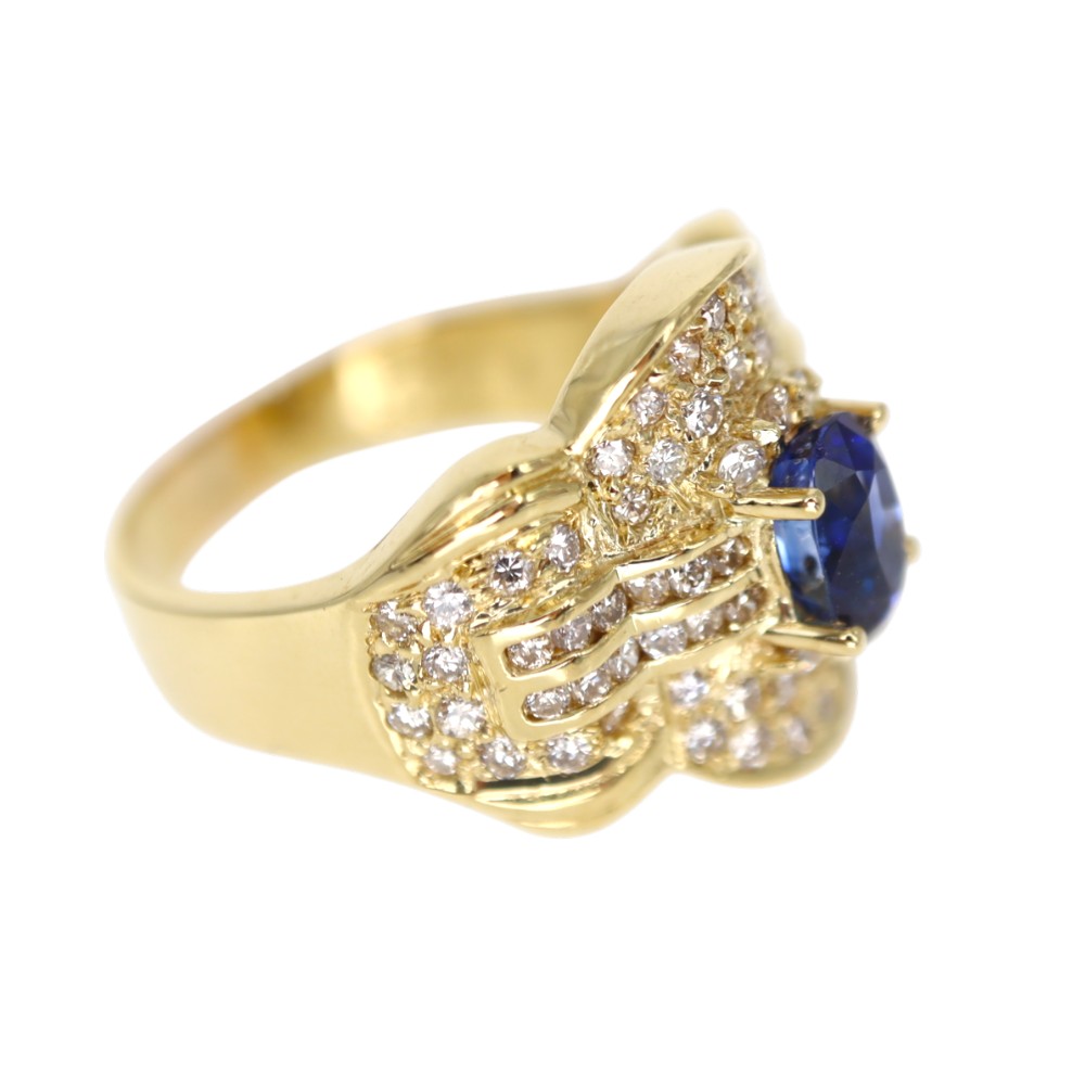 煌びやかにセットされたダイヤモンドがサファイアの美しさを引き立てている指輪です。 中央にセッティングされたサファイアと、それを囲うダイヤモンドがボリューミーでゴージャスさを演出します。
