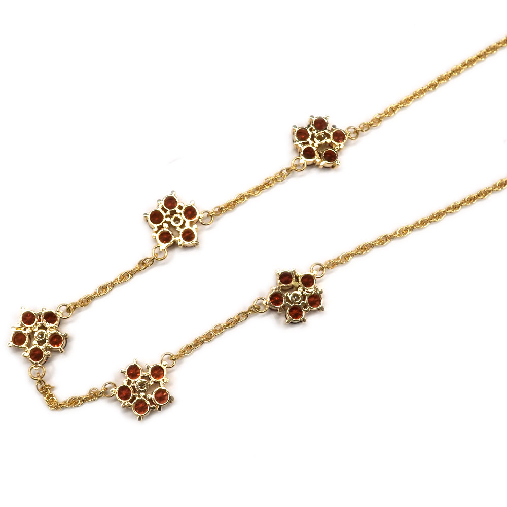 ガーネットとダイヤモンドがセッティングされたフラワーモチーフのネックレスです。 モチーフが5Pあり華やかな印象です。 首元のアクセントにいかがでしょうか。
