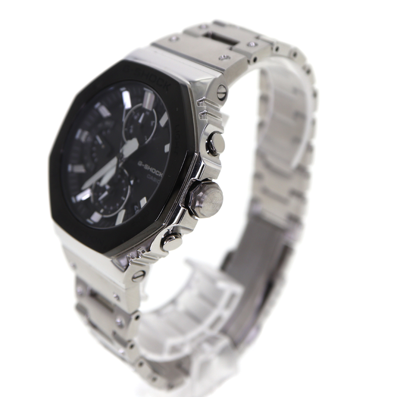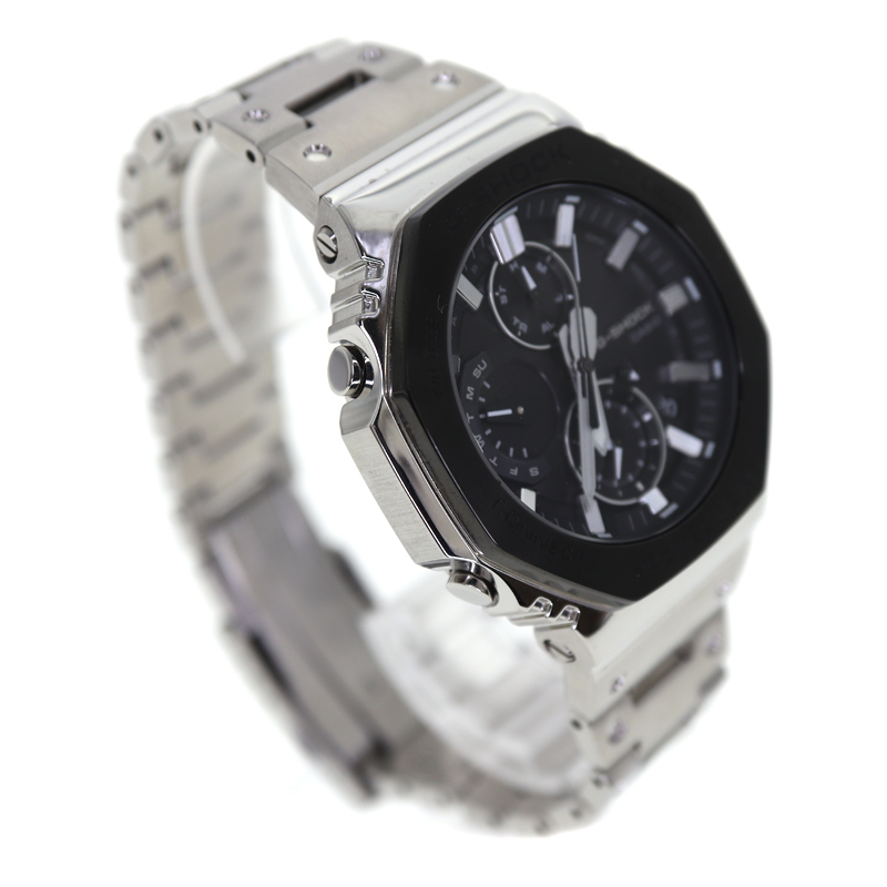 G-SHOCKの八角形アイコンデザインを踏襲したフルメタルモデルです。 ブラックIP加工を施したステンレスケースとブレスレットが精悍な印象を与え、シンプルながら存在感のある外観です。 モバイルリンク機能によるスマートフォン連携で自動時刻修正やワールドタイムが可能、タフソーラー搭載で電池交換の手間も軽減。 耐衝撃構造と20気圧防水を備え、アウトドアや日常使いでも安心して使用できます。 日本製ならではの仕上げと堅牢性を両立し、スタイルと機能性を高いレベルで融合させた一本です。 お探しの方はこの機会にぜひいかがでしょうか。