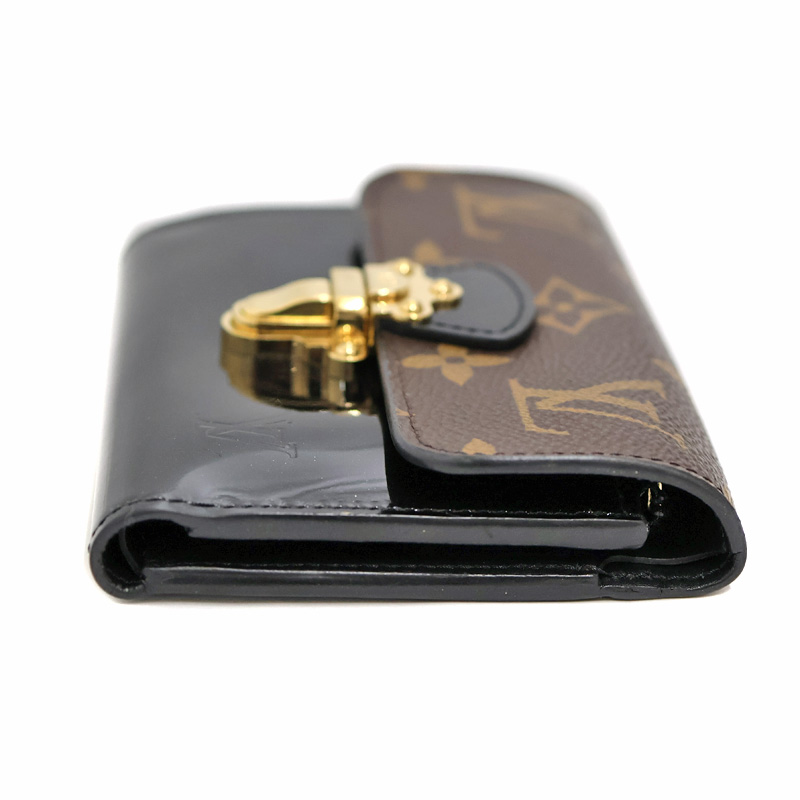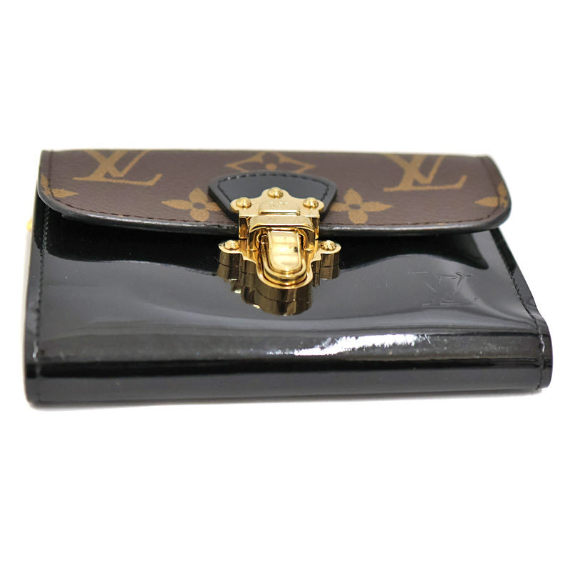 ルイ・ヴィトンの伝統的なトランクのロックから着想を得た特徴的なデザインのクラスプが際立つ、アイコニックなモノグラム・キャンバスとなめらかなパテントカーフレザーを組み合わせた財布「ポルトフォイユ・チェリーウッド コンパクト」。