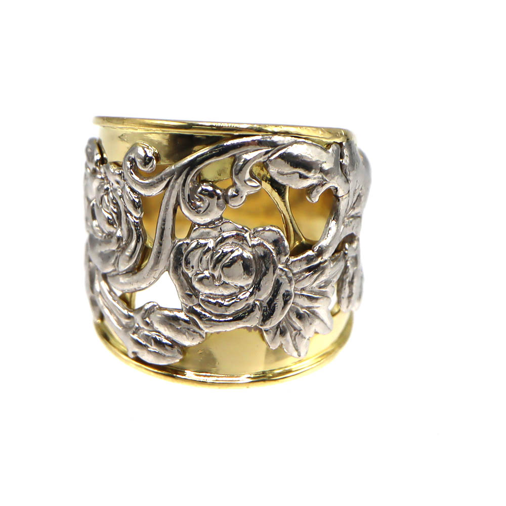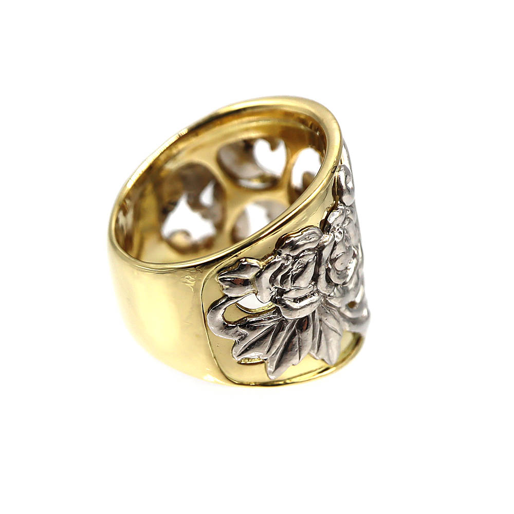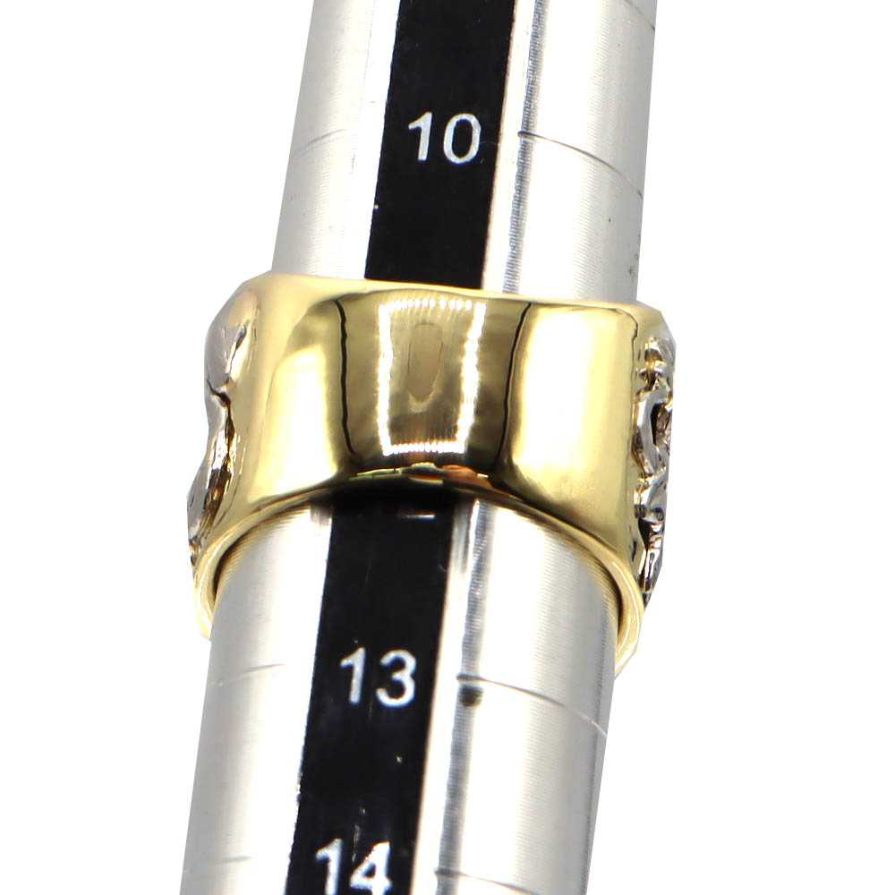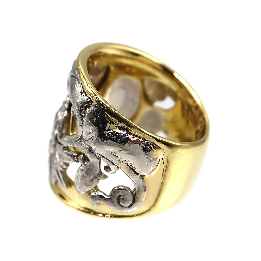 K18ゴールドの華やかな輝きと、Pt900プラチナの凛とした存在感を組み合わせた、インパクト抜群のデザインリングです。