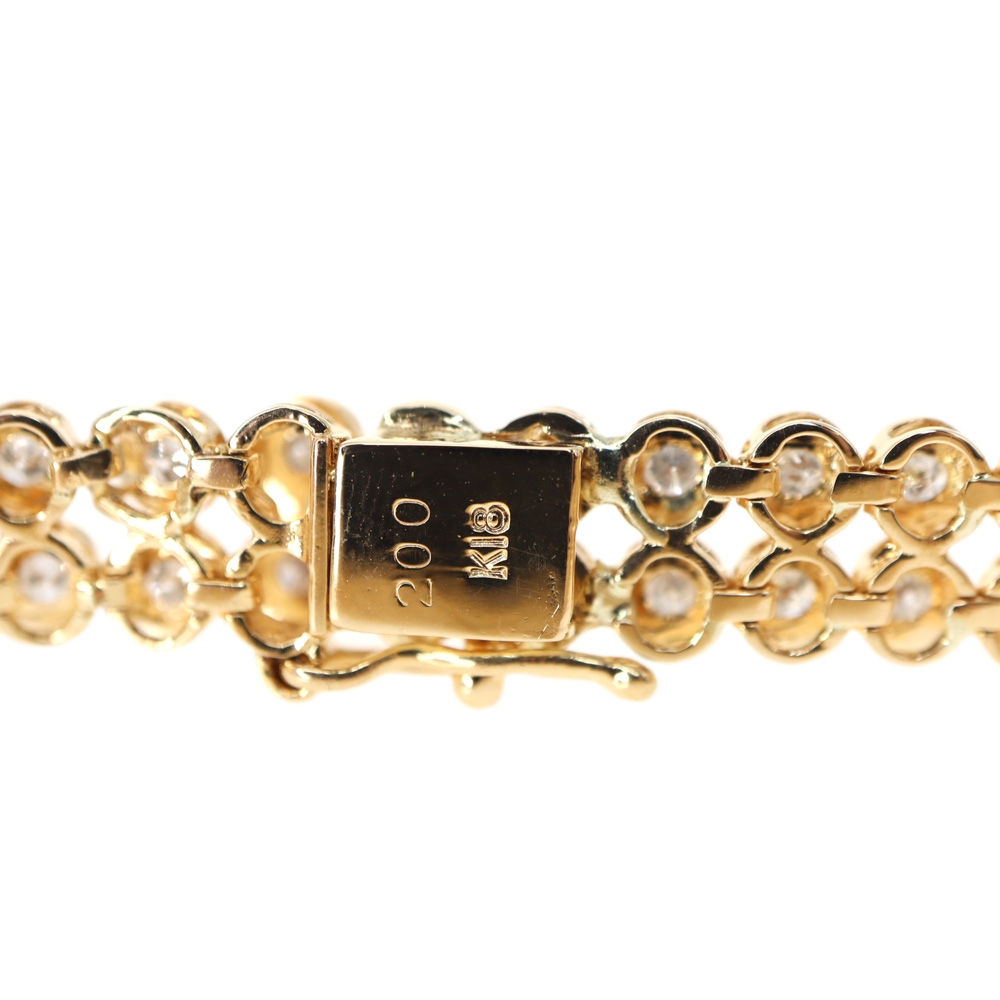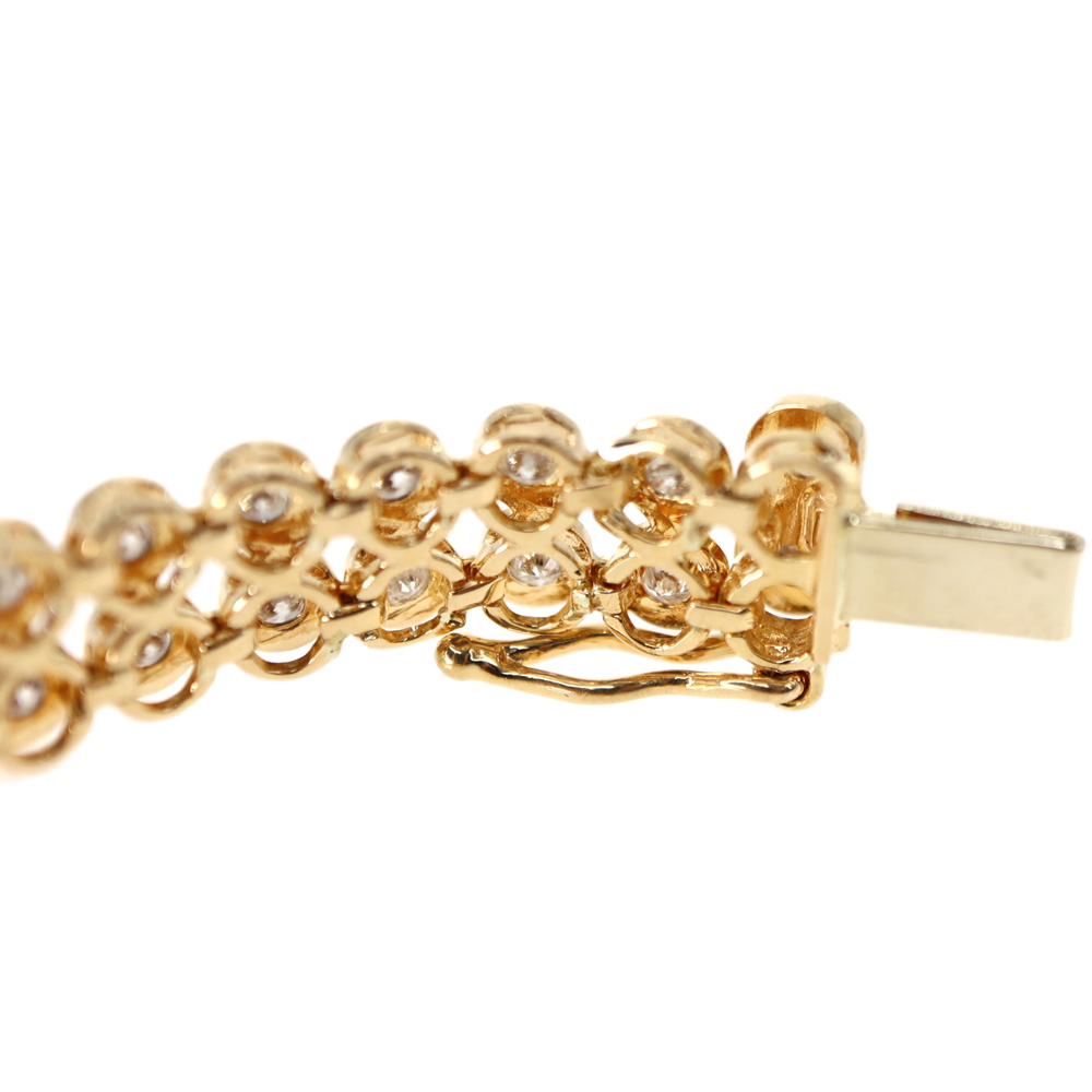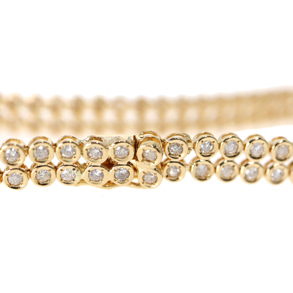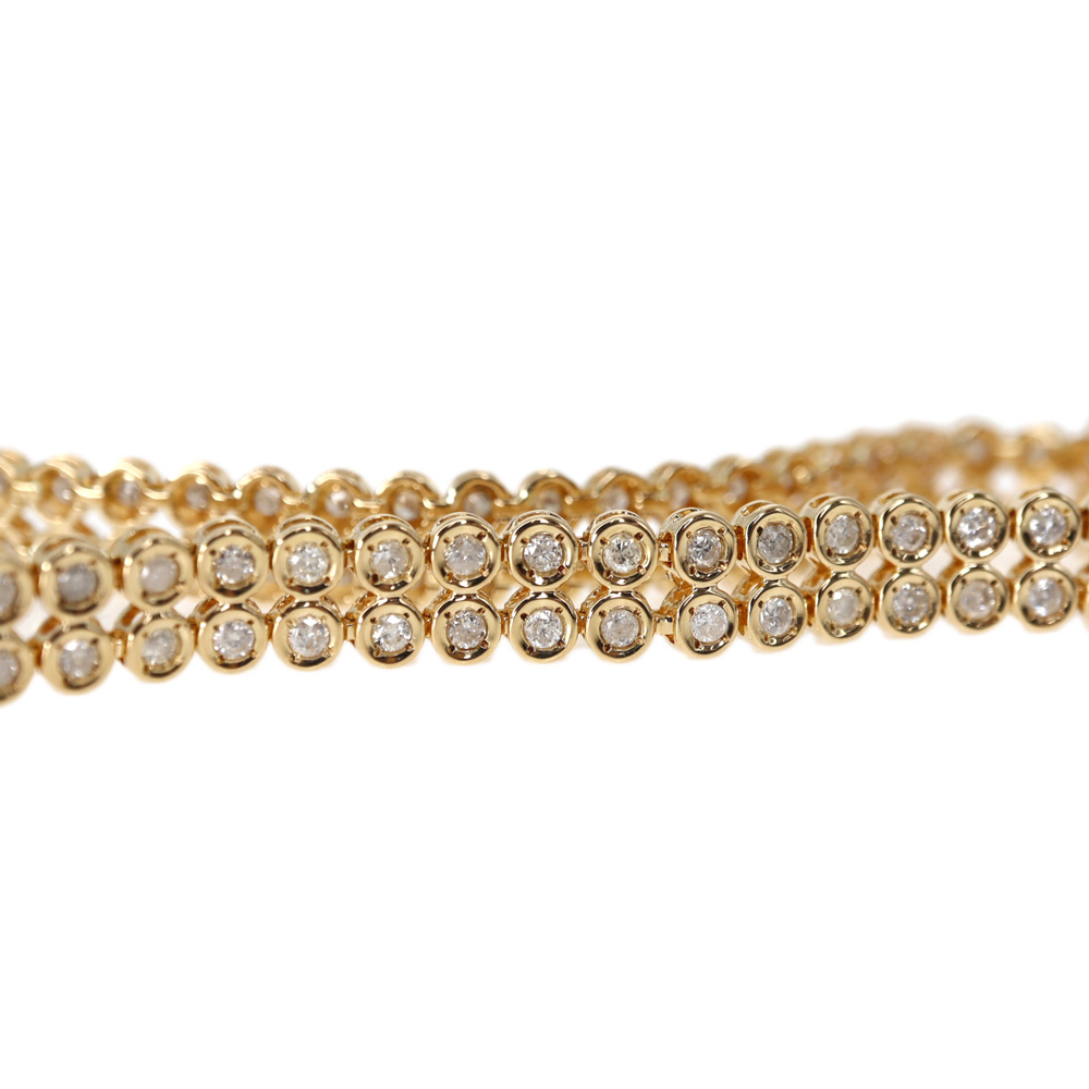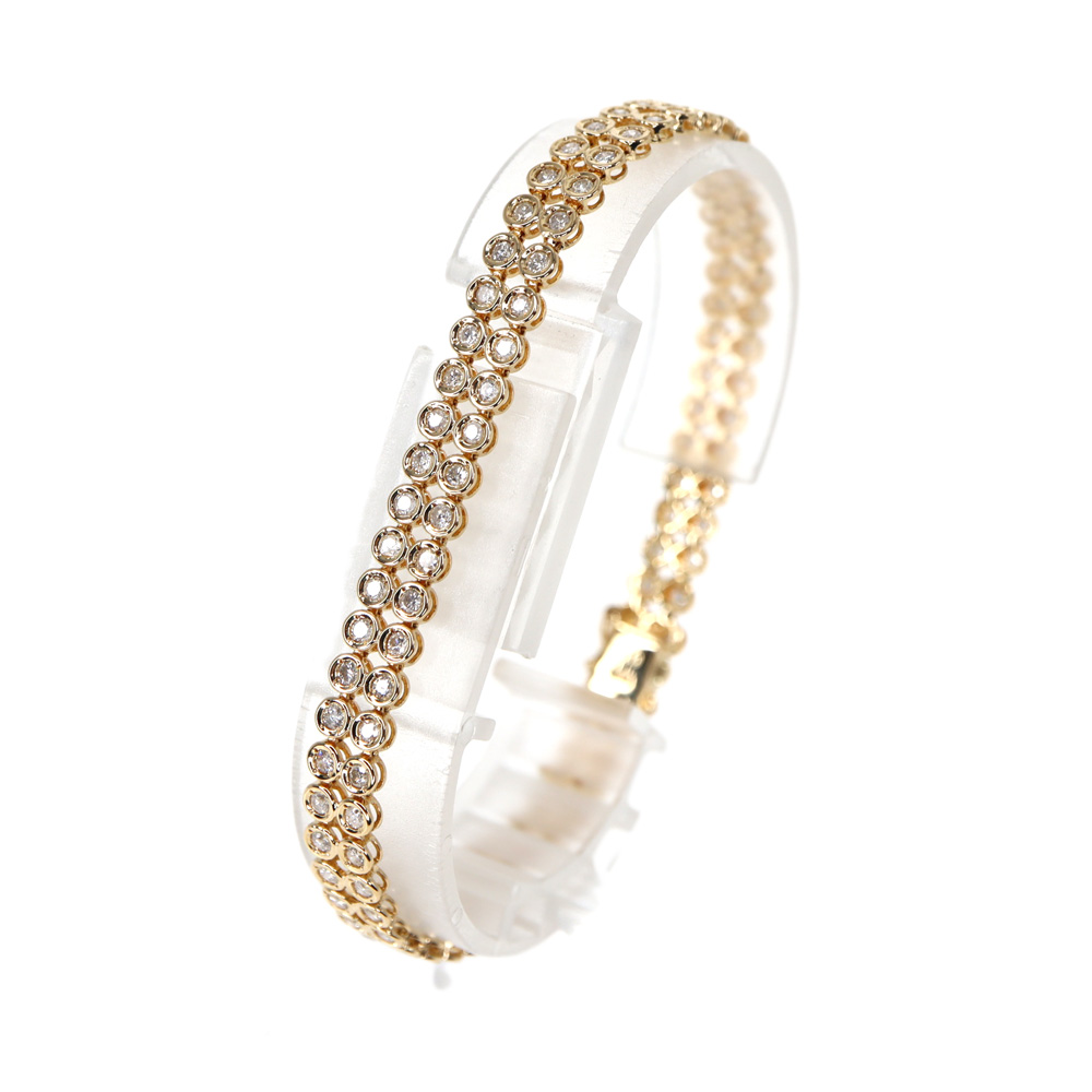 2列を埋め尽くすようにダイヤモンドがセッティングされた重厚感のあるテニスブレスレットです。 ゴールド×ダイヤモンドの組み合わせで華やかな印象のお品となっておりシーン問わずお使い頂けます。