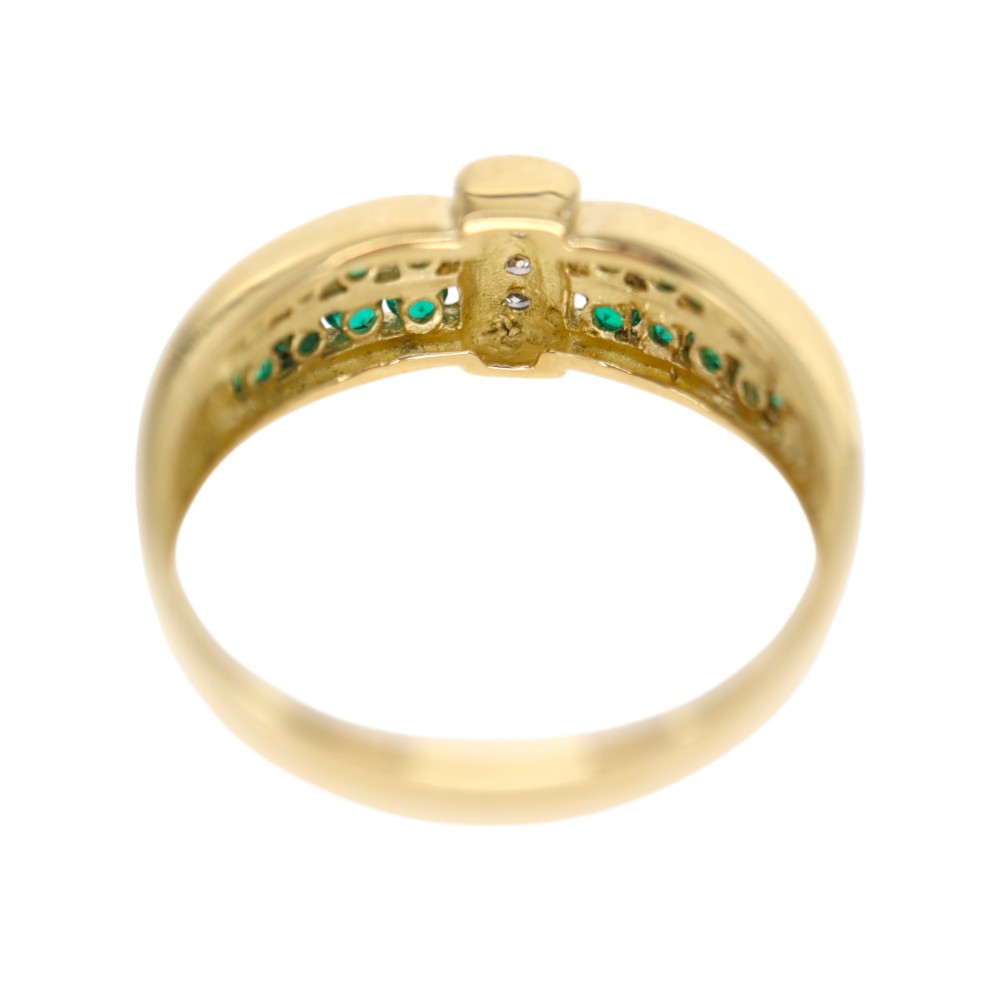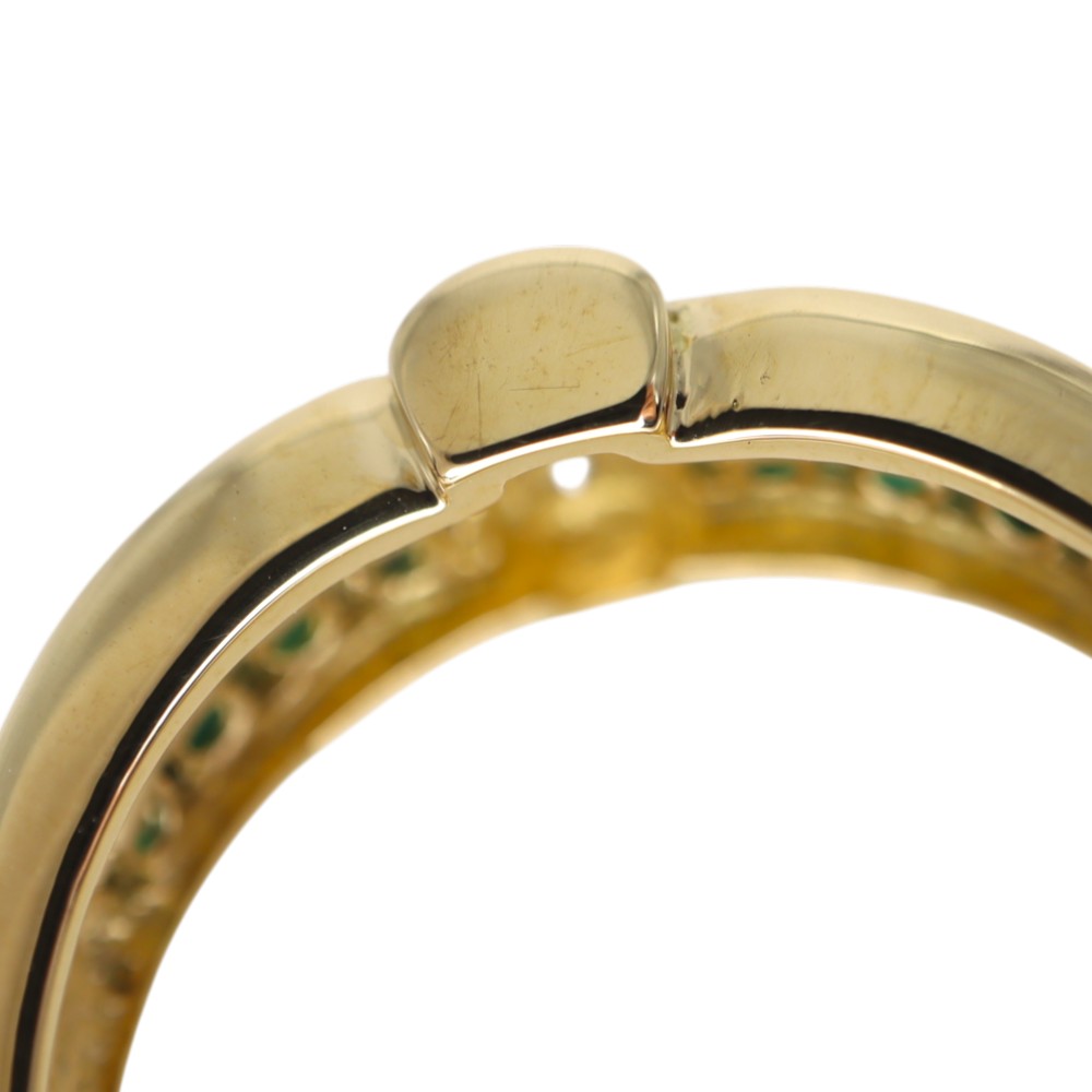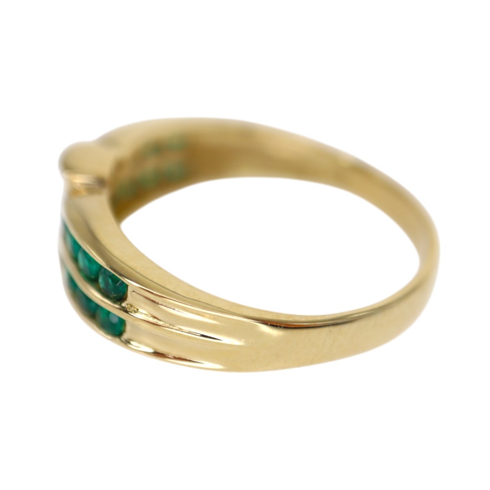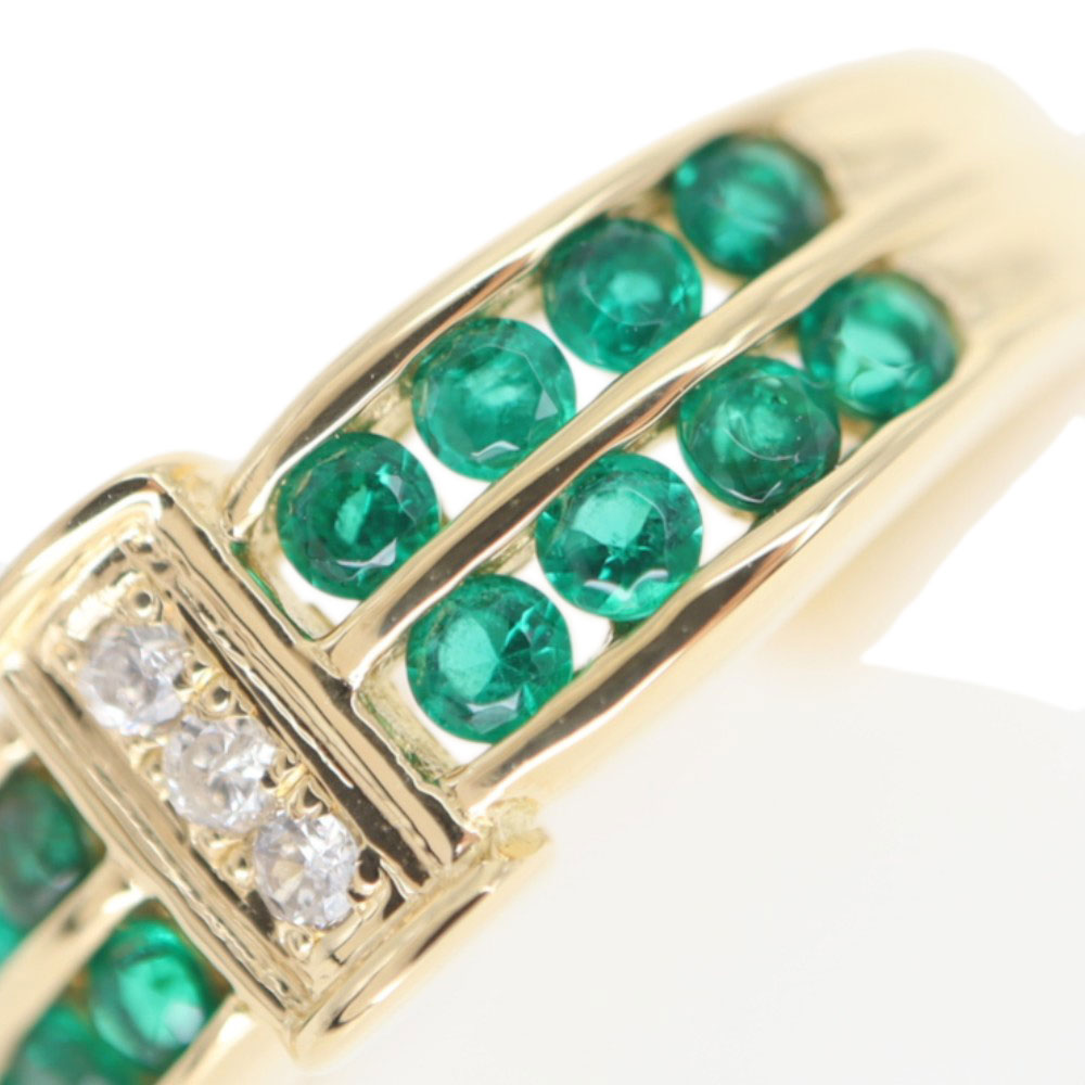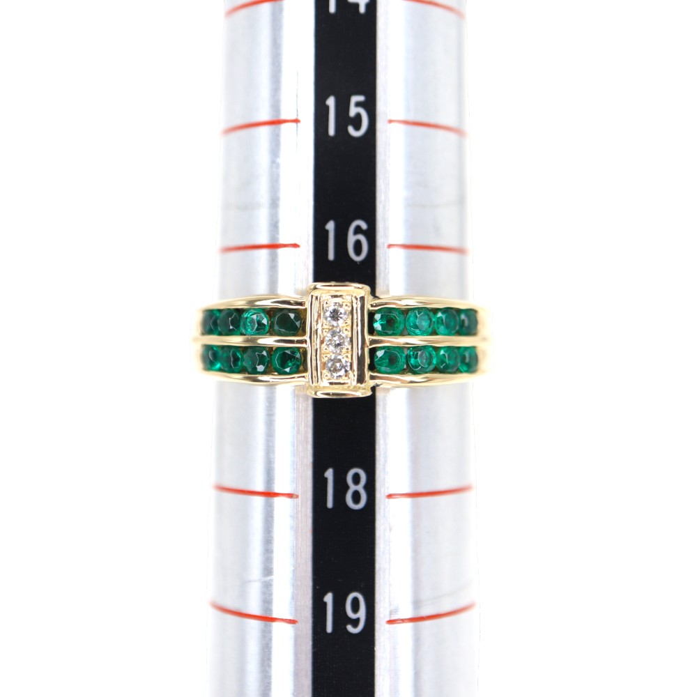 上下2列に施されたエメラルドが目を惹くリングです。 ダイヤモンドもセッティングされているので、よりゴージャスさを感じることができます。