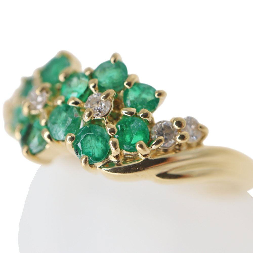二つのお花が並んだようなデザインが目を惹くリングです。 エメラルドのグリーンと華やかなゴールドで上品さが感じられます。 ダイヤモンドもセッティングされているので、よりゴージャスさを感じることができます。
