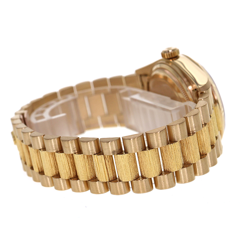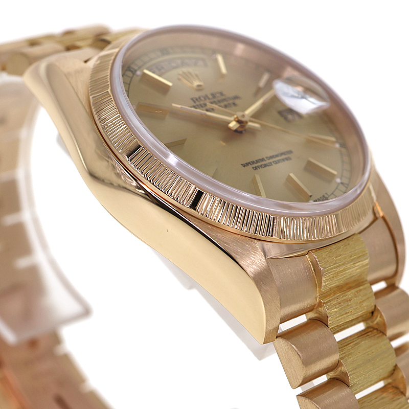 1956年の誕生以来、ロレックス・オイスターの頂点に君臨し続ける「デイデイト」。 K18イエローゴールドを惜しみなく使用したその佇まいは、フラッグシップに相応しい圧倒的な重厚感を放ちます。 本個体の最大の特徴は、熟練の職人技を想起させる「バーク(樹皮)仕上げ」のベゼルです。 定番のフルーテッドベゼルとは一線を画す、有機的で落ち着いた煌めきは、見る者に知性と個性を印象付けます。 文字盤は気品溢れるオリジナルシャンパンゴールド。 ムーブメントには、実用性を高めるクイックチェンジデイト機能を備えたハイビート仕様の「Cal.3055」を搭載。 ヴィンテージの風合いと日常使いの利便性が高次元で融合した、まさに一生モノと呼ぶにふさわしい逸品です。