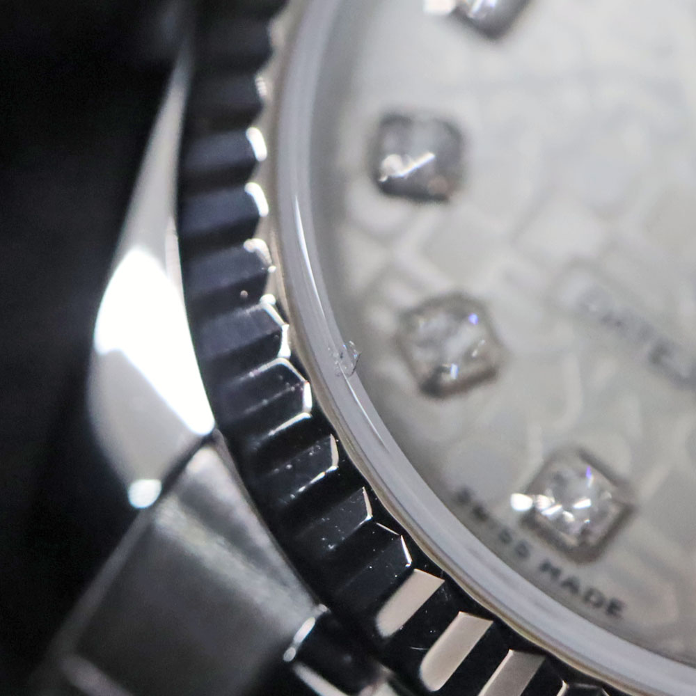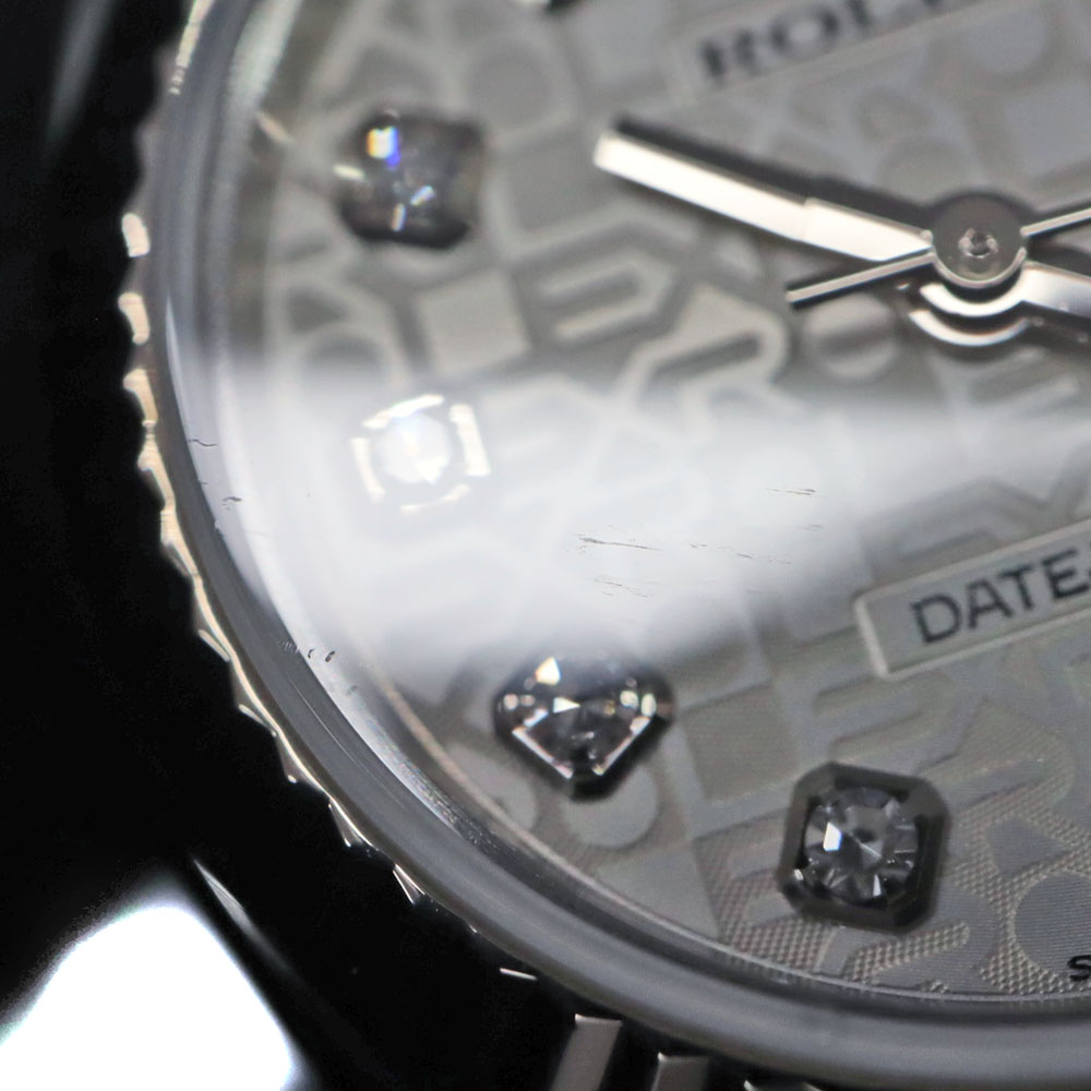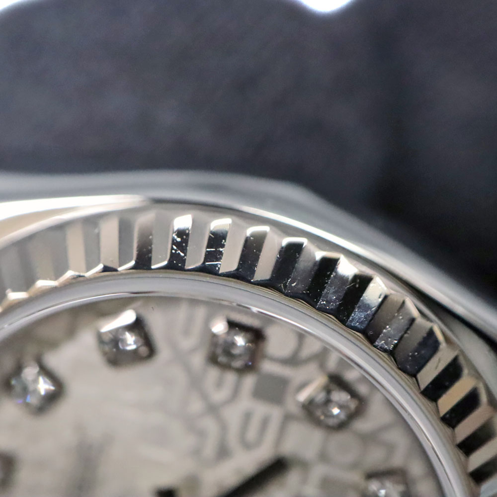 デイトジャストとは午前0時頃瞬時に日付が変わるデイトジャスト機構、全回転式ローターを搭載したパーペチュアル機構、ロレックス三大機構を搭載したモデル。 美しいカッティングが施されたフルーテッドベゼルとブレスレット中央パーツにホワイトゴールドを使用したラグジュアリー感溢れるモデルですので、手元を華やかにしてくれます。 今回は文字盤に10ポイントのダイヤモンドと文字盤に「ROLEX」と刻まれたコンピュータ文字盤となっており、通常モデルよりもよりロレックスを感じられる仕様となっております。