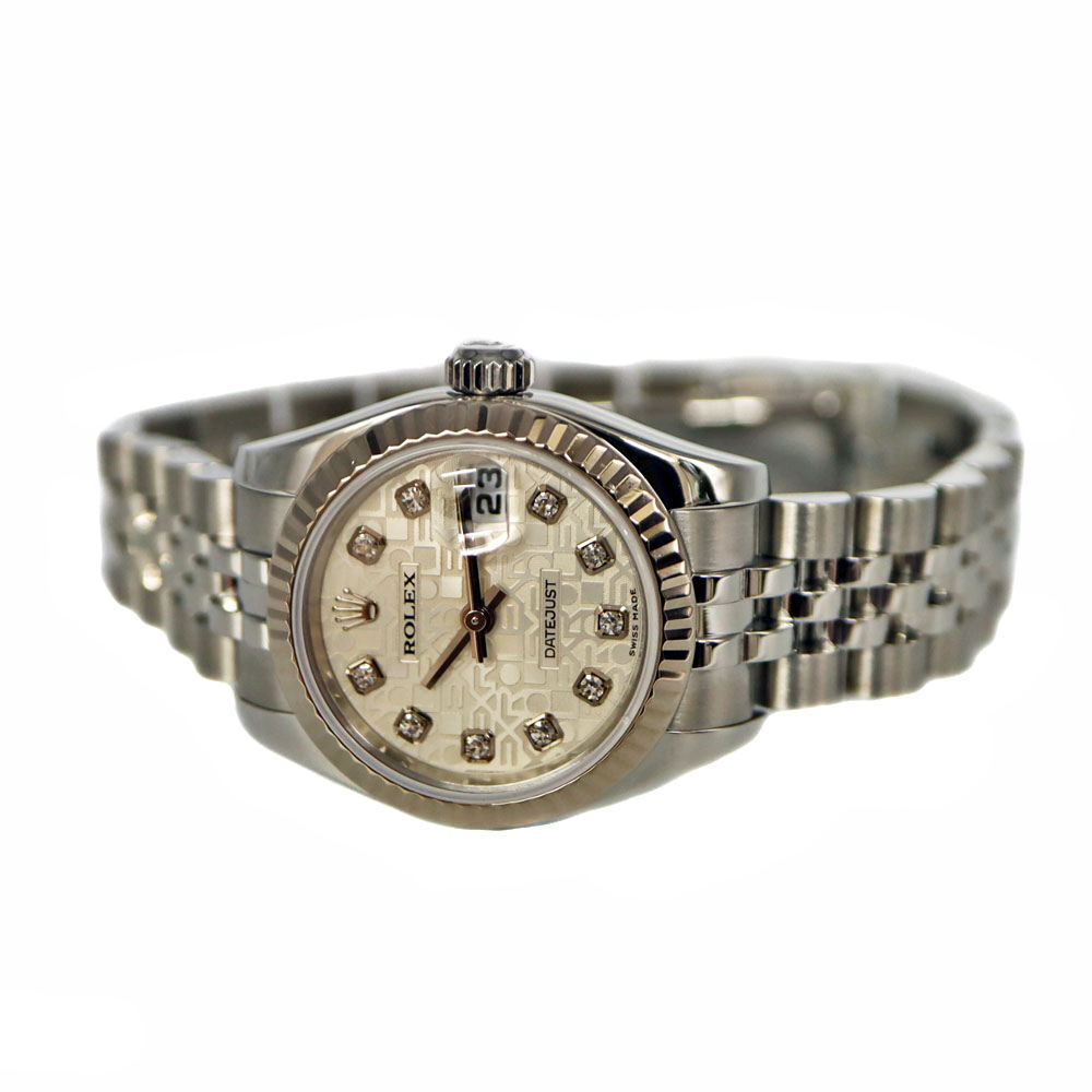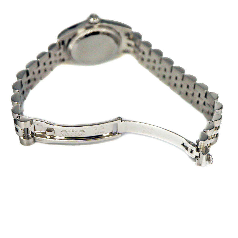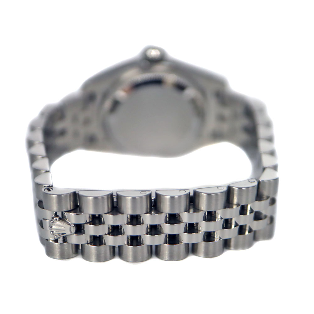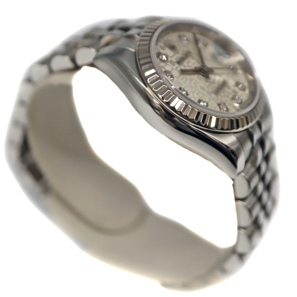 デイトジャストとは午前0時頃瞬時に日付が変わるデイトジャスト機構、全回転式ローターを搭載したパーペチュアル機構、ロレックス三大機構を搭載したモデル。 美しいカッティングが施されたフルーテッドベゼルとブレスレット中央パーツにホワイトゴールドを使用したラグジュアリー感溢れるモデルですので、手元を華やかにしてくれます。 今回は文字盤に10ポイントのダイヤモンドと文字盤に「ROLEX」と刻まれたコンピュータ文字盤となっており、通常モデルよりもよりロレックスを感じられる仕様となっております。