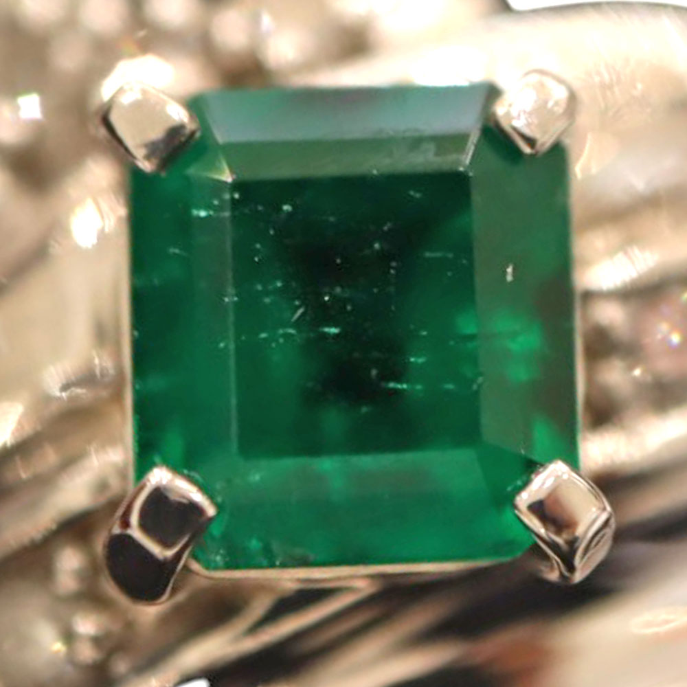 中央に輝く大きなメラルドが目を惹くリングです。 周りにはラインを描くようにダイヤモンドがセッティングされており華やかな印象のお品となっています。