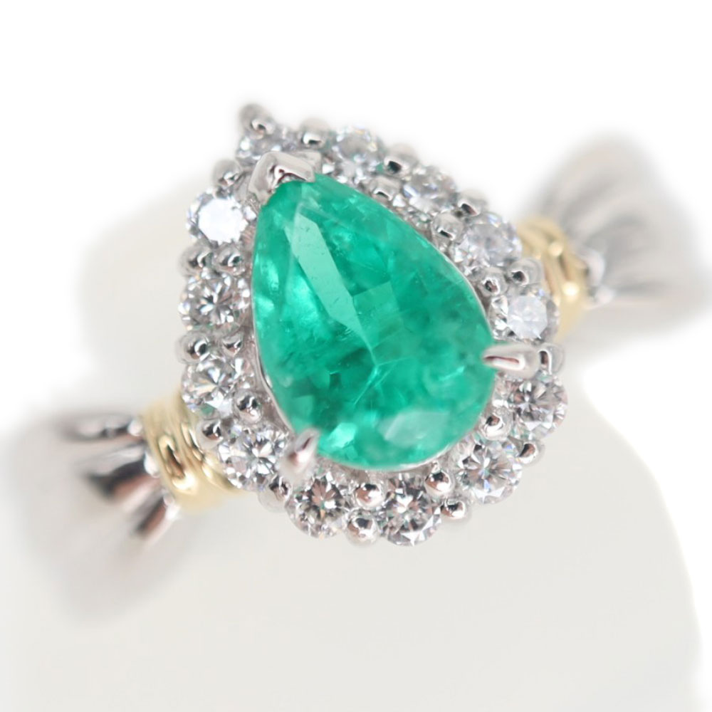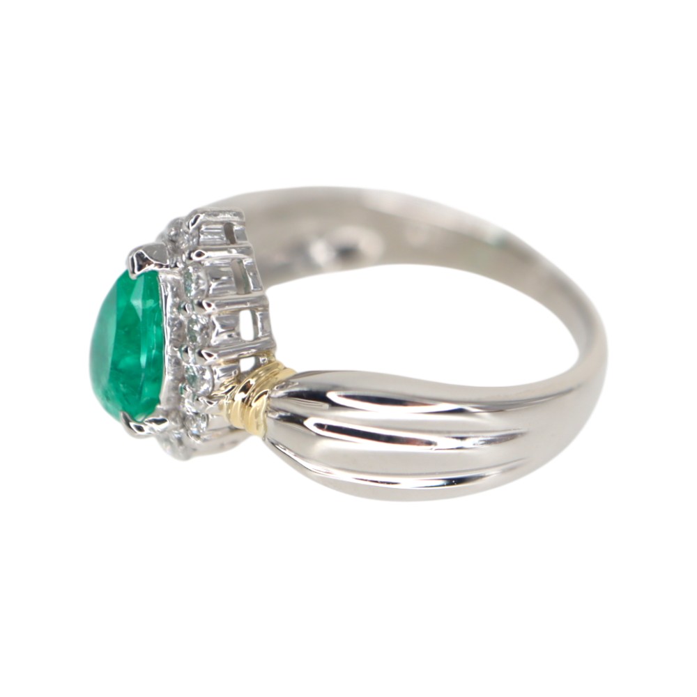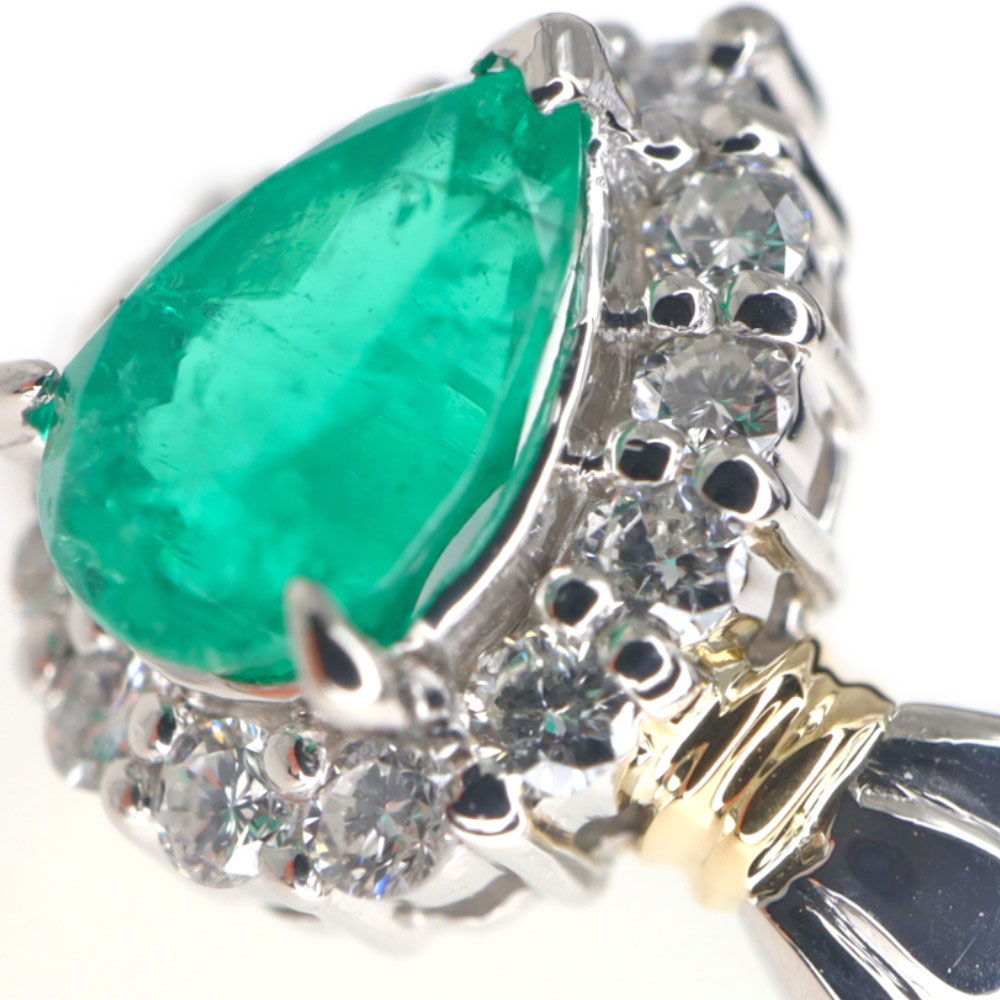 中央にはドロップモチーフのエメラルドがセッティングされています。 0.819ctもあるゴージャスな指輪です。 さり気なくゴールドもアクセントにデザインされているので、シンプルながらもデザイン性を感じます。