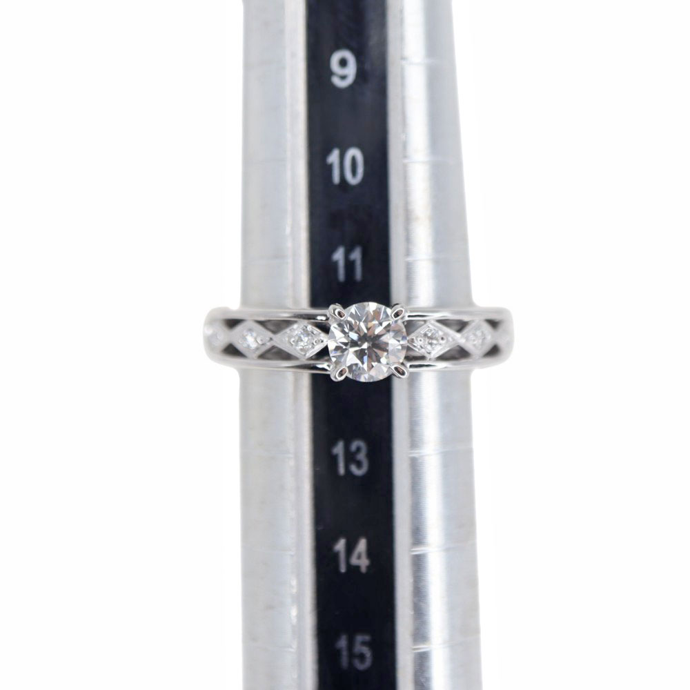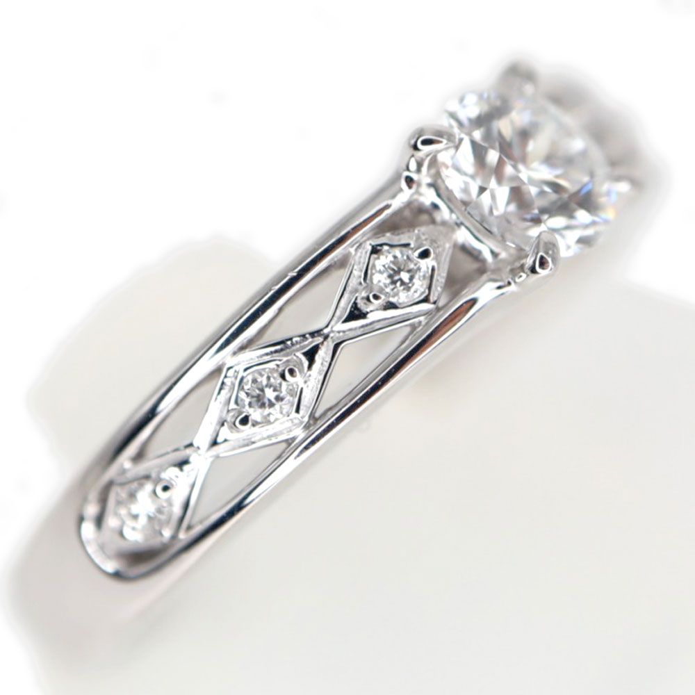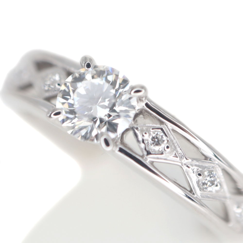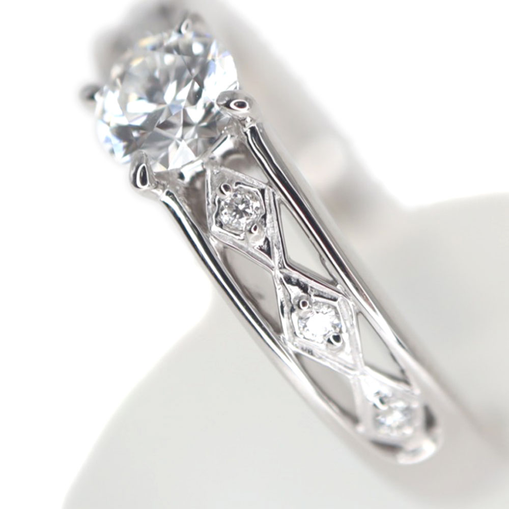 中央に輝く一粒ダイヤモンドと、レースのような繊細なデザインがサイドに施されたリング。 シンプルなデザインなので、重ね付けとしてもお楽しみいただけます。