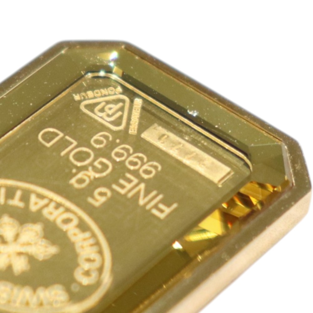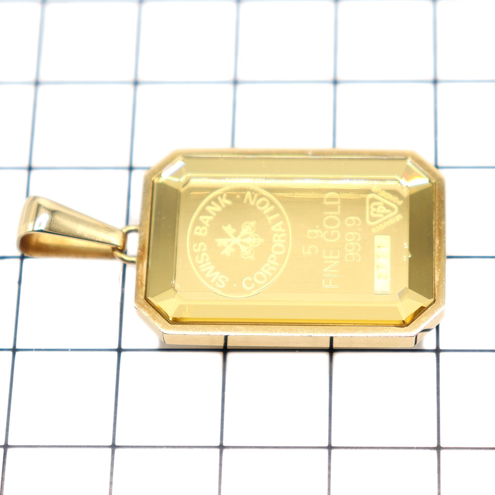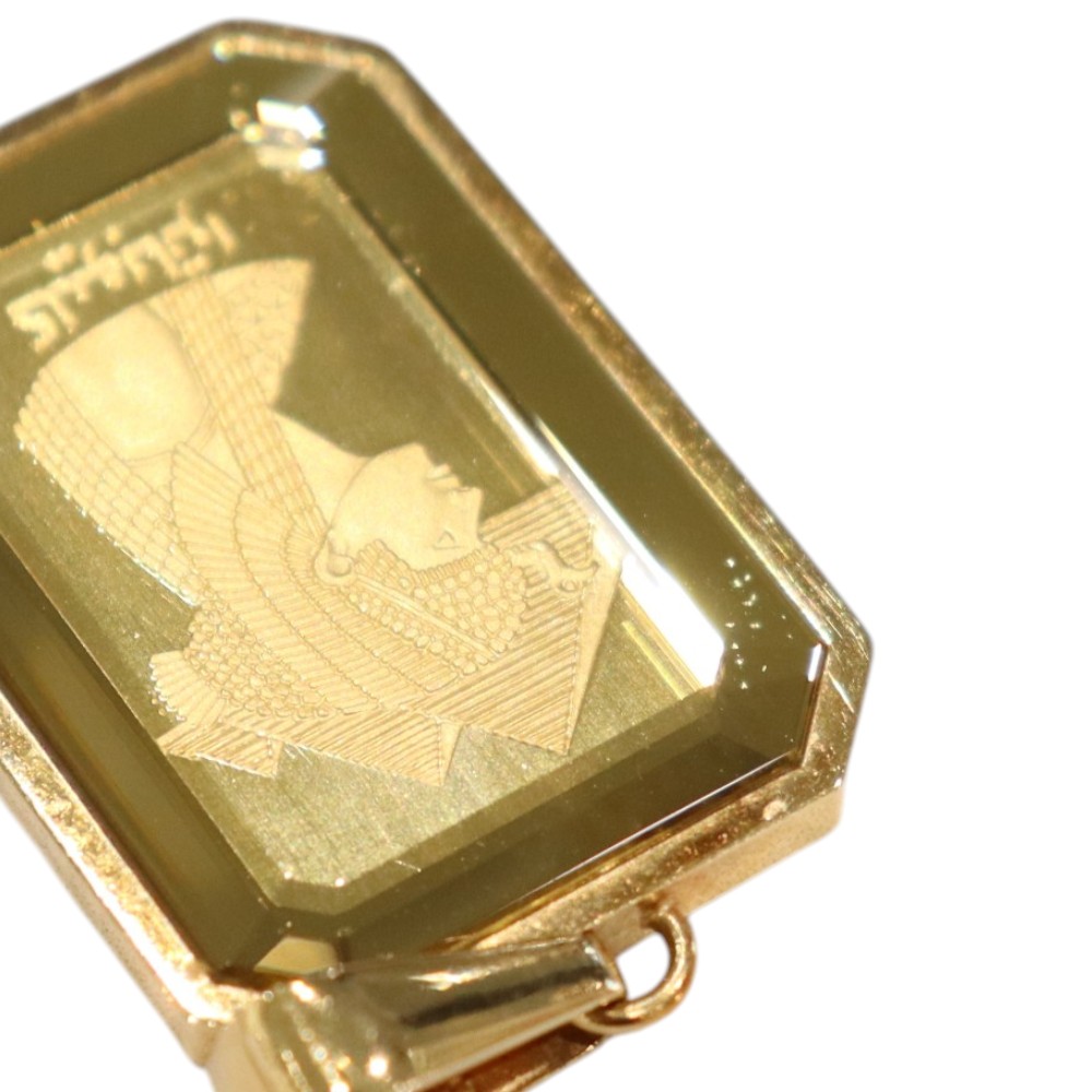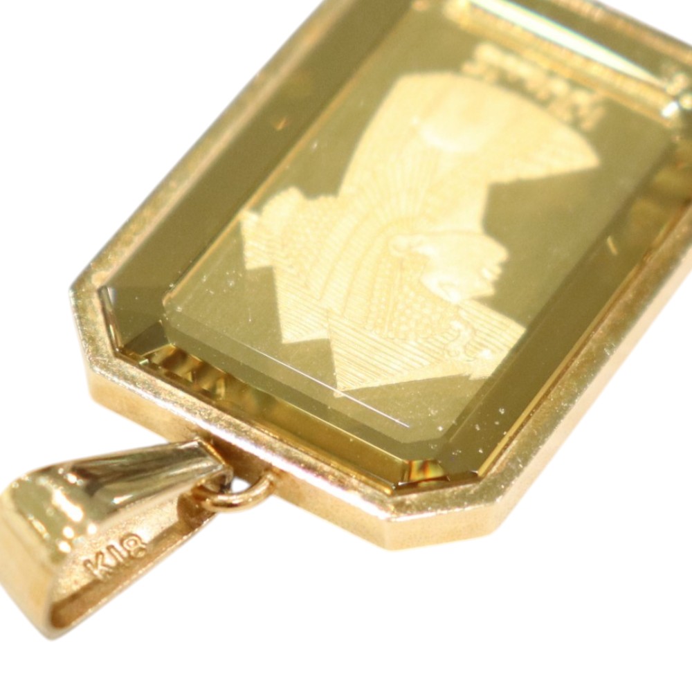 K18イエローゴールドの枠に、ミニバーが(5g)がセットされた高級感あふれるペンダントトップです。 クレオパトラの横顔が刻まれたミニバーはアクセサリーとしての美しさも引き立つお品物です。 存在感のあるミニバーは、資産価値の高さはもちろん、ファッションアイテムとしても人気。