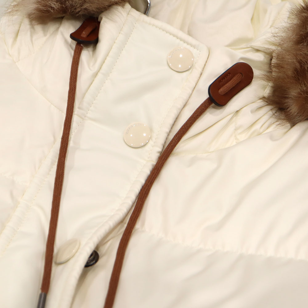 | 素材/カラー | 本体:ポリエステル100% 取り外しできるフードひだ襟:羊毛革 ニットリブ:ポリエステル66% ナイロン31% ポリウレタン3% レザートリミング:牛革 中綿:ダウン50% フェザー50% |