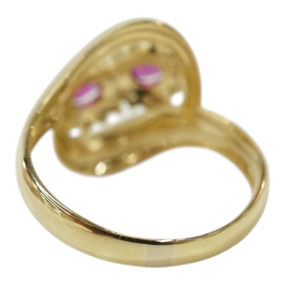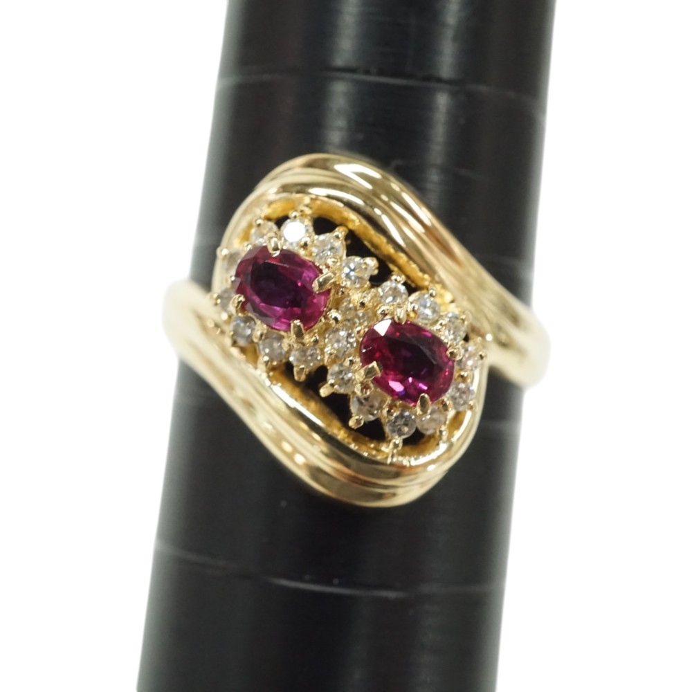 ルビーとダイヤモンドが施された存在感のある上品なデザインリングです。 お手元のアクセントにぜひいかがでしょうか。