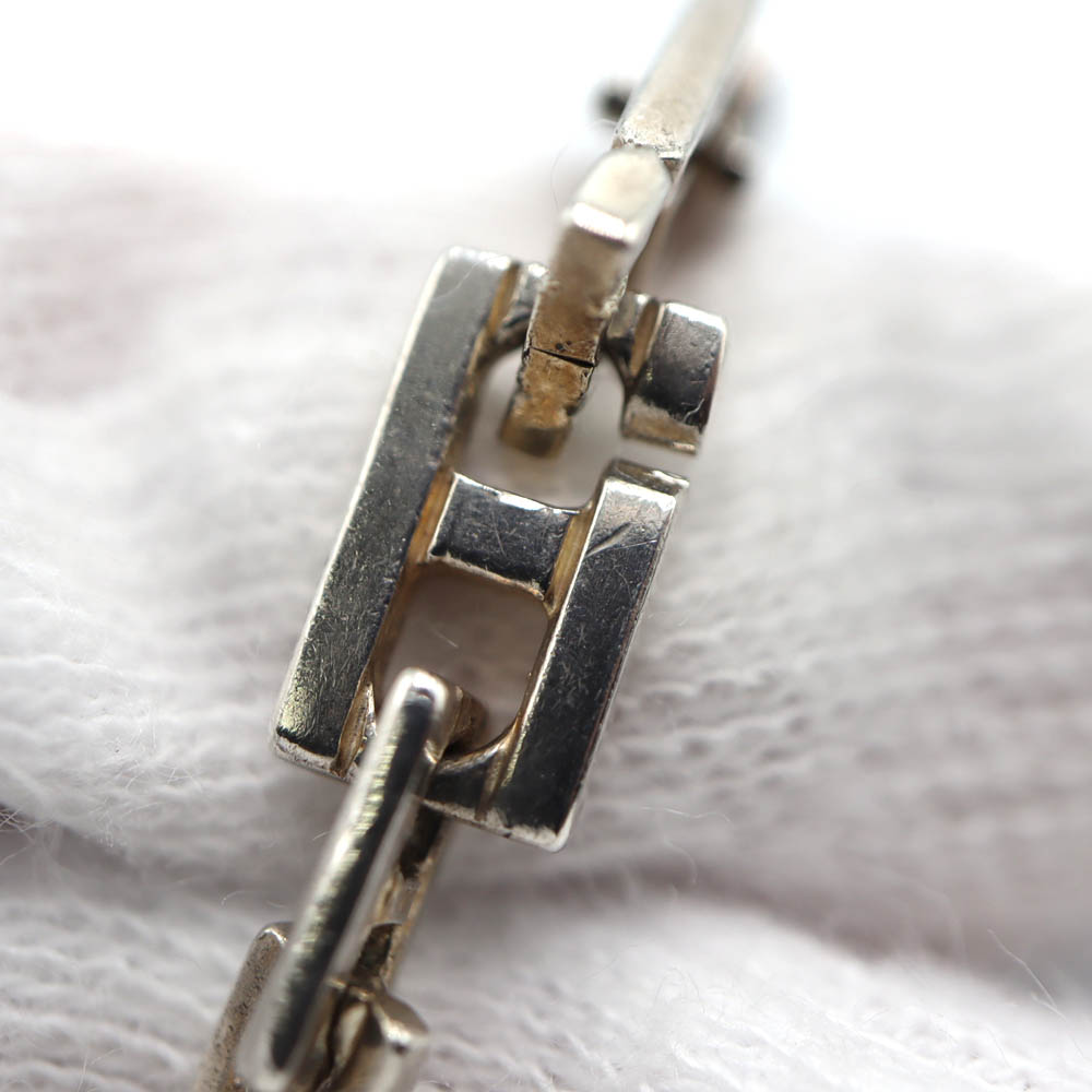 Hの形の金具が連なったシンプルでおしゃれなブレスレットです。 ファッションのポイントにぜひいかがでしょうか。 ■1マス、1cm×1cmの台の上で撮影しております。 ■傷、くすみ、変色がございますがまだまだお使いいただけるお品です。 |