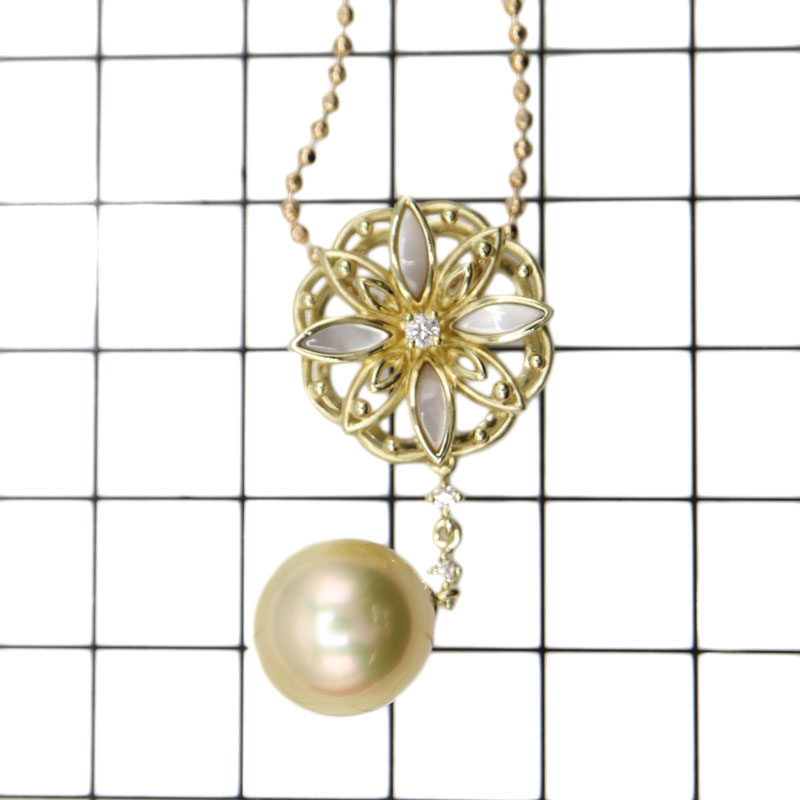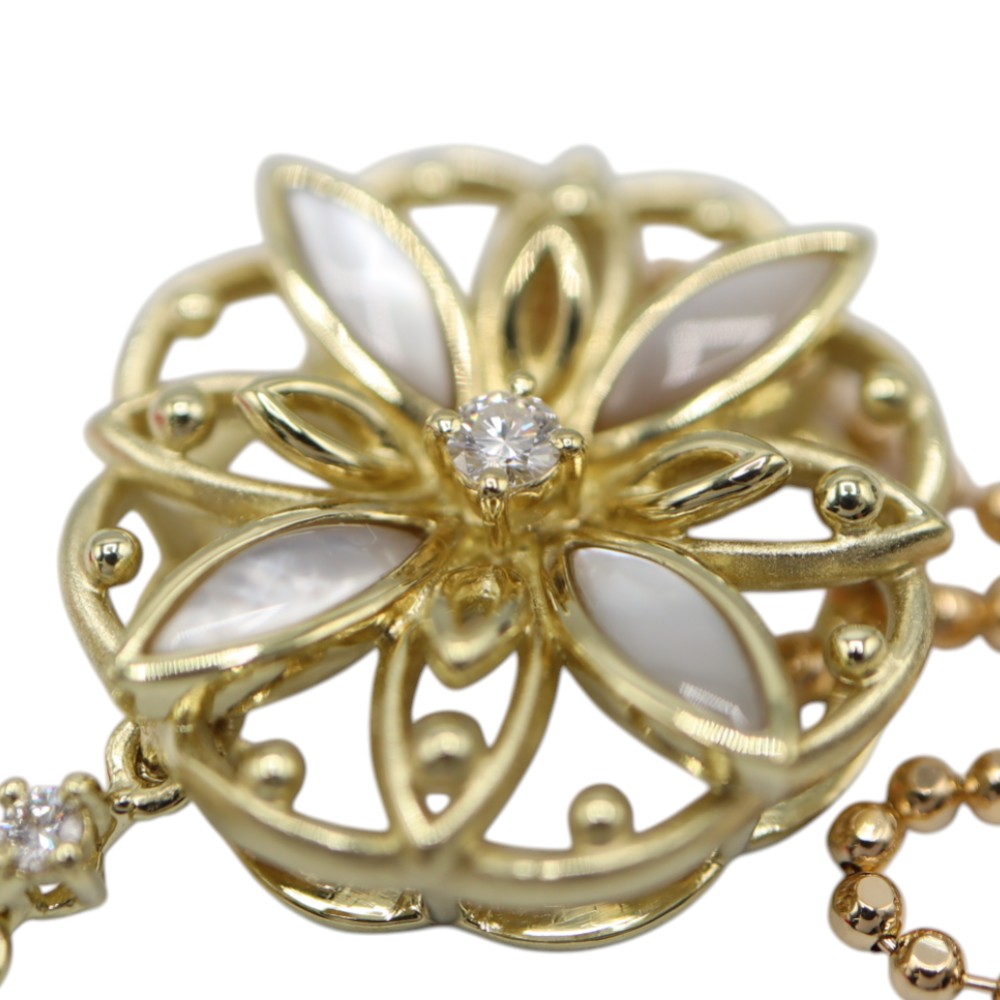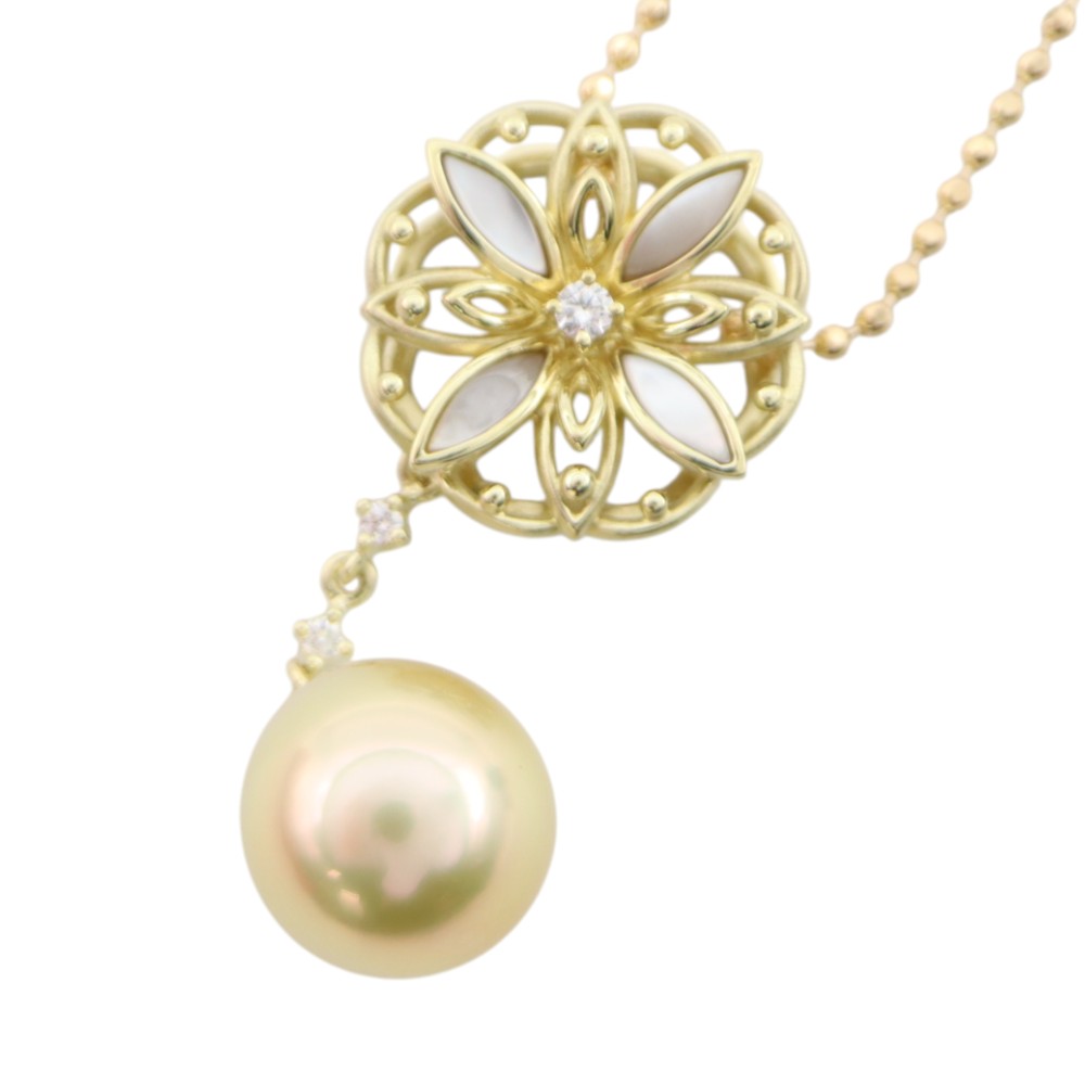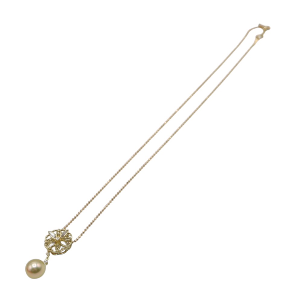 パールと花のようなモチーフがダイヤでつながれたゴージャスなデザインのネックレスです。 特別な日の装いにプラスすると、コーディネートが格段に上がる一品です。