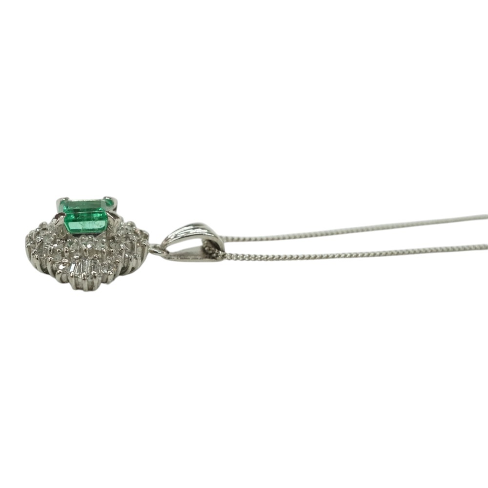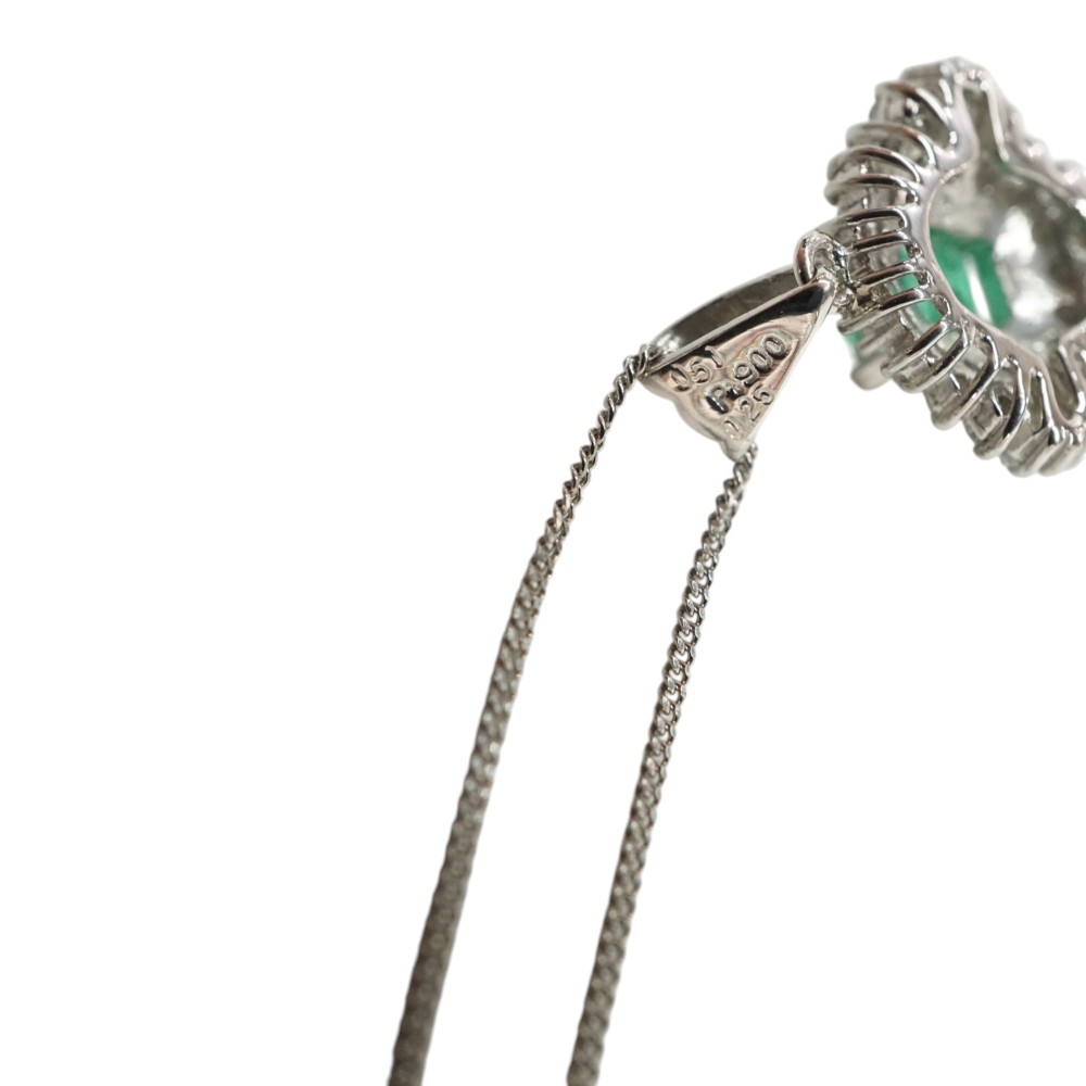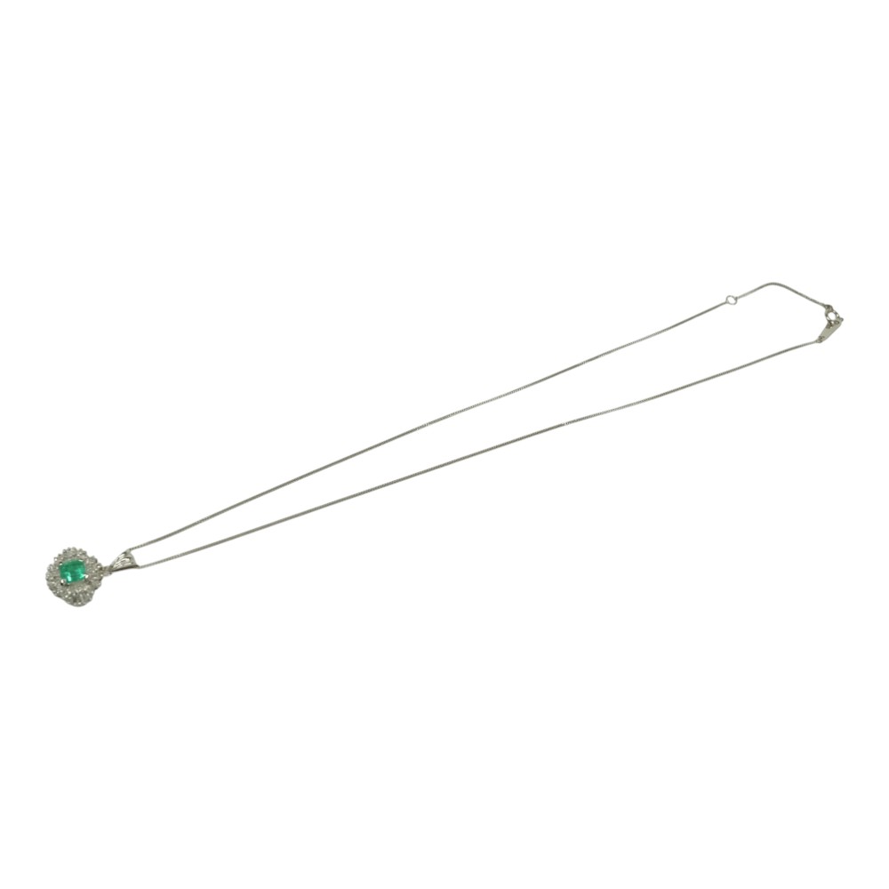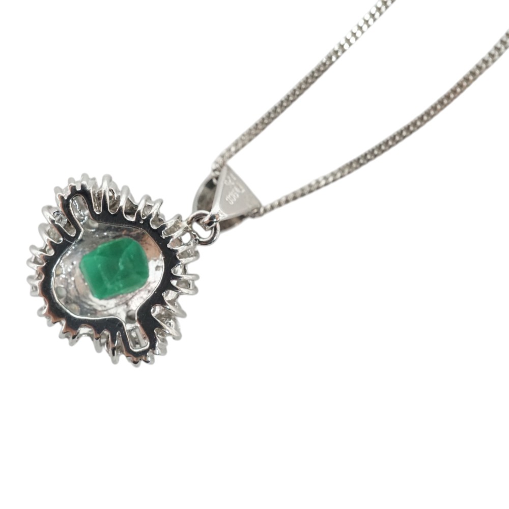 エメラルドとダイヤモンドが綺麗に輝くデザインで程よい存在感あるネックレスです。 首元のアクセントにいかがでしょうか。