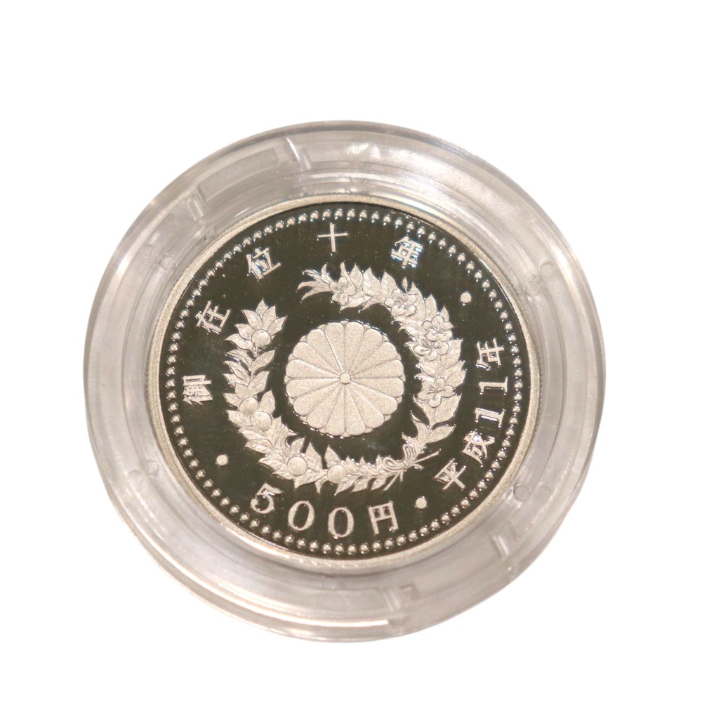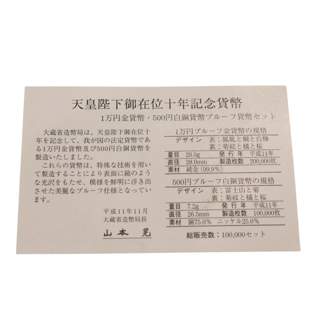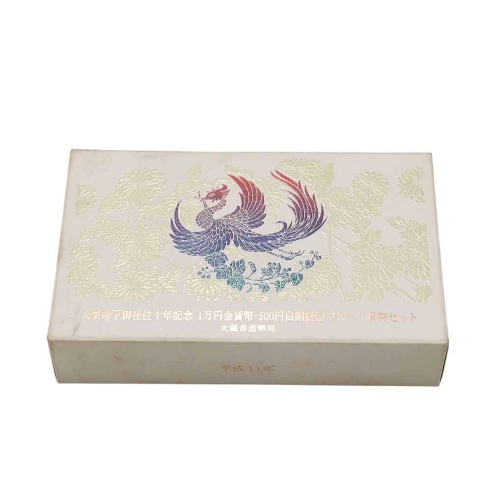 明仁上皇陛下が天皇陛下であらせられた頃、御在位10周年を記念して1999年(平成11年)12月に日本造幣局より発行された、天皇陛下御在位10年記念金貨と500円白銅貨のプルーフセットです。