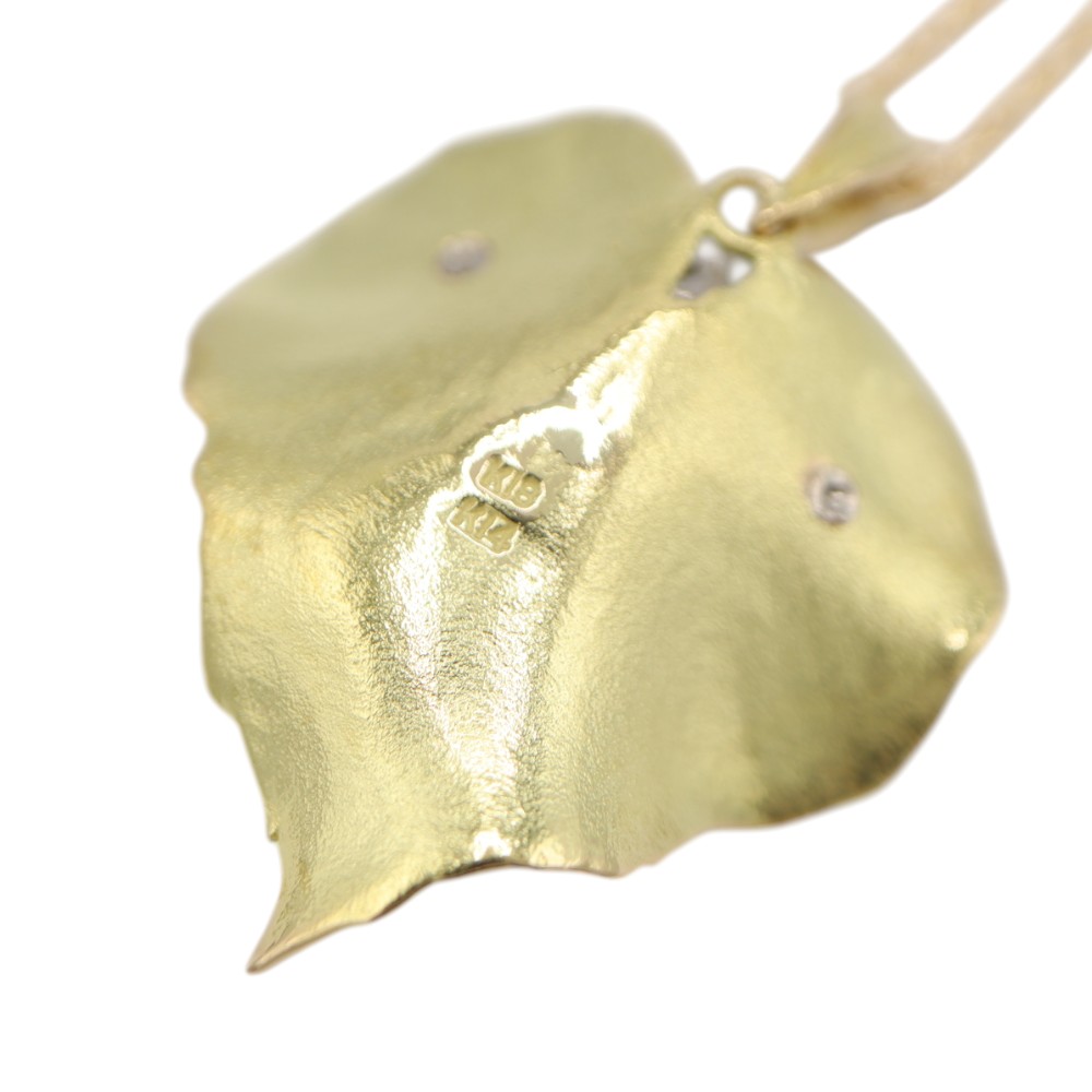 K18の上質な素材で形作られた、生命力を感じるリーフデザインのトップが目を惹くネックレスです。