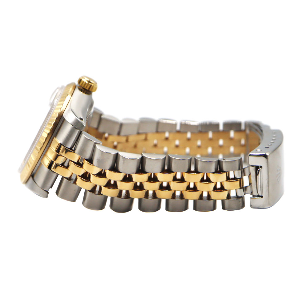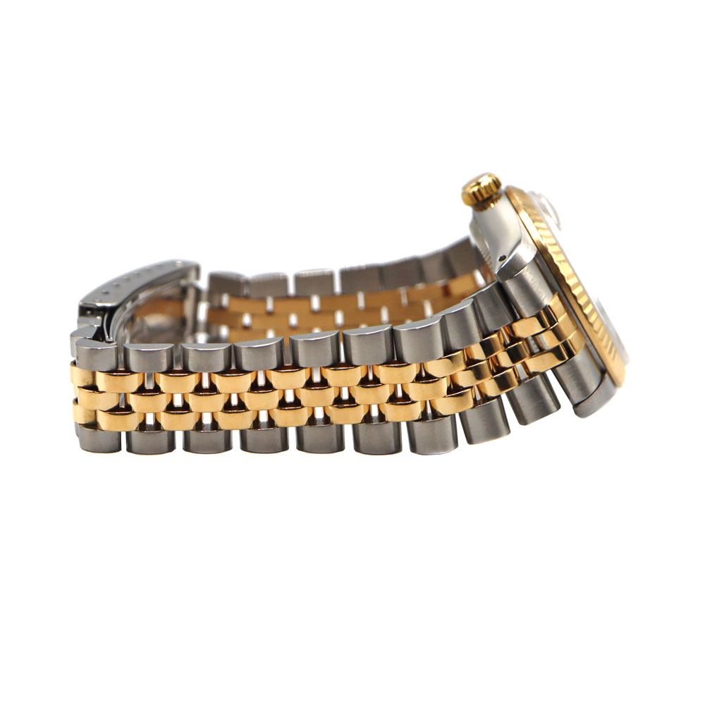 美しいカッティングが施されたフルーテッドベゼルとブレスレット中央パーツに18Kイエローゴールドを使用したラグジュアリー感溢れるモデルですので、手元を華やかにしてくれます。