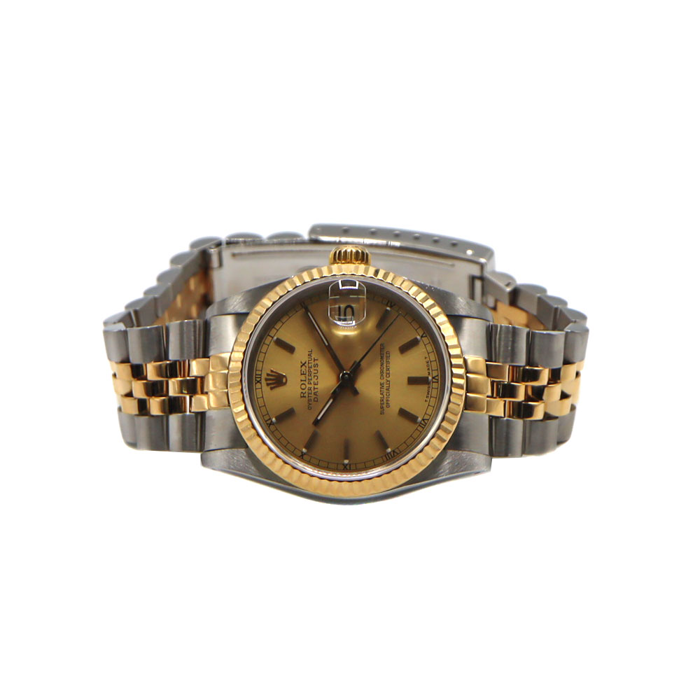 デイトジャストとは午前0時頃瞬時に日付が変わるデイトジャスト機構、全回転式ローターを搭載したパーペチュアル機構、ロレックス三大機構を搭載したモデルです。