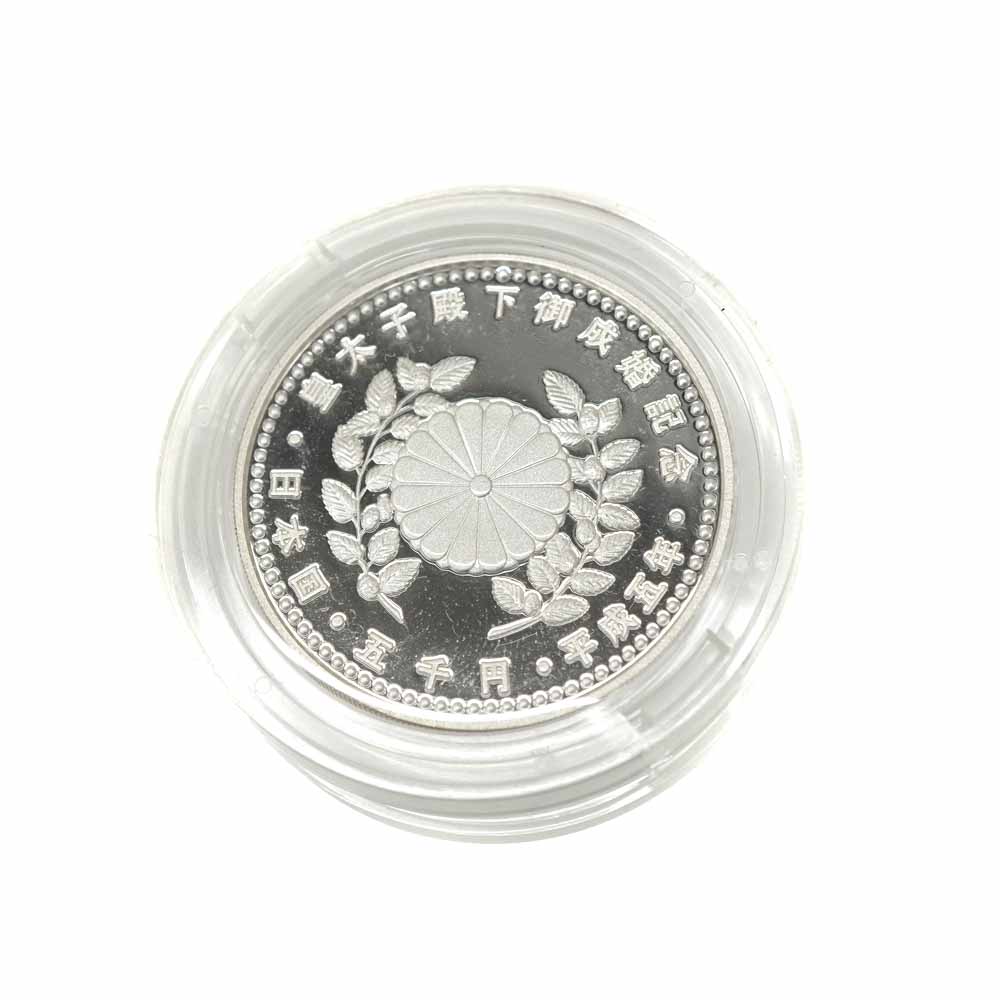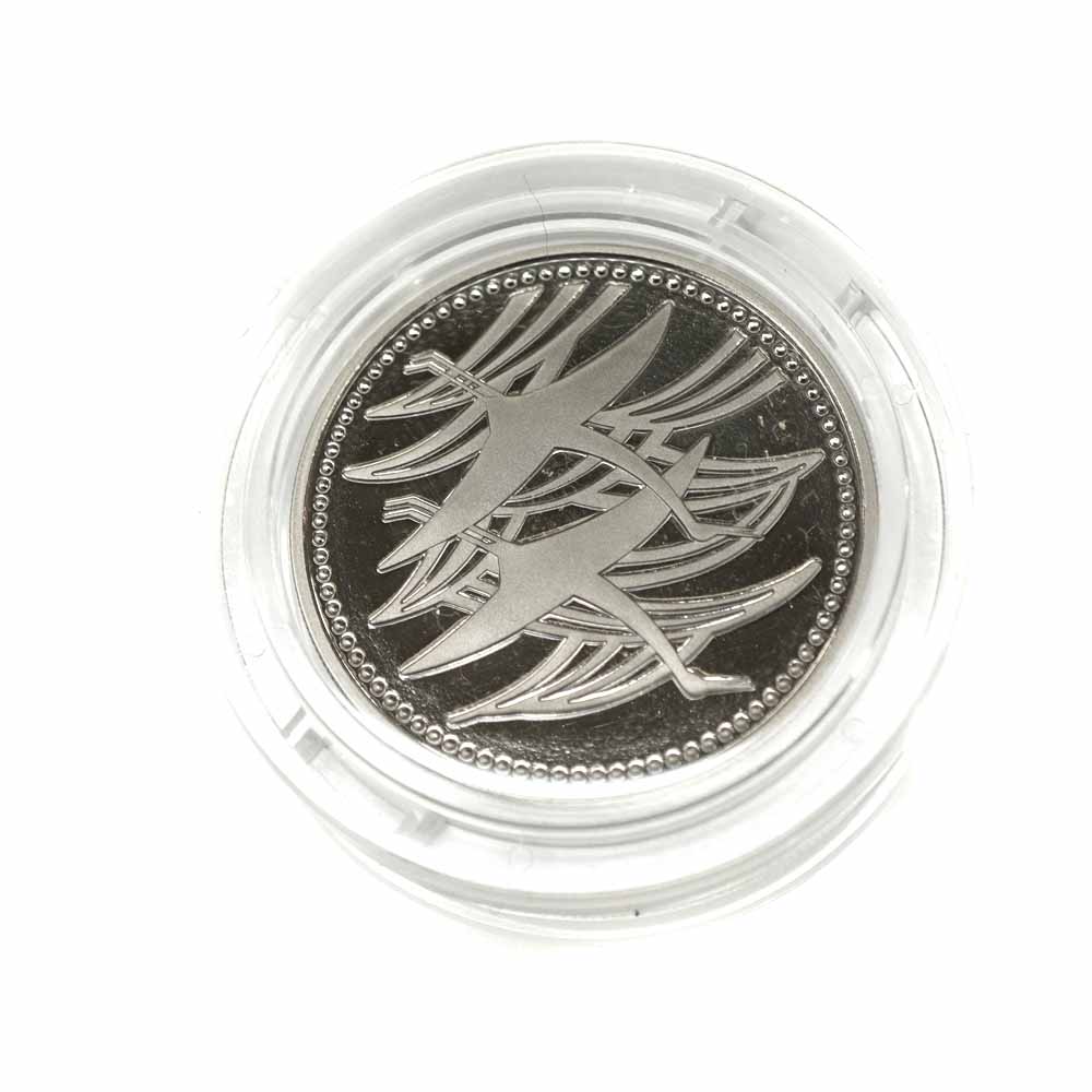 瑞鳥の鶴二羽と波、瑞雲がデザインされた記念硬貨です。 五万円、五千円、五百円の三種類がセットになったアイテムです。 コレクションなどにいかがでしょうか。