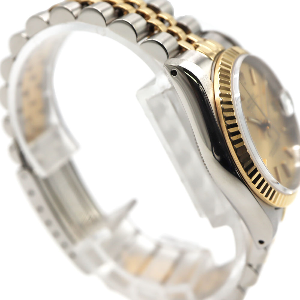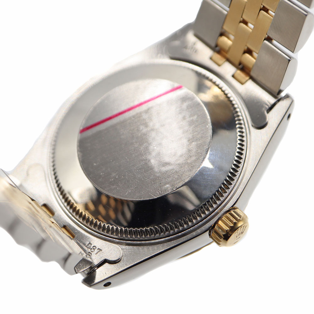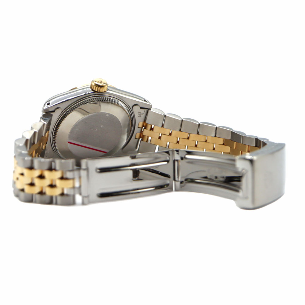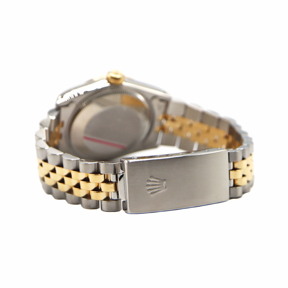 デイトジャストとは午前0時頃瞬時に日付が変わるデイトジャスト機構、全回転式ローターを搭載したパーペチュアル機構、ロレックス三大機構を搭載したモデルです。 美しいカッティングが施されたフルーテッドベゼルとブレスレット中央パーツに18Kイエローゴールドを使用したラグジュアリー感溢れるモデルですので、手元を華やかにしてくれます。