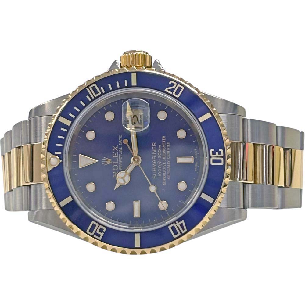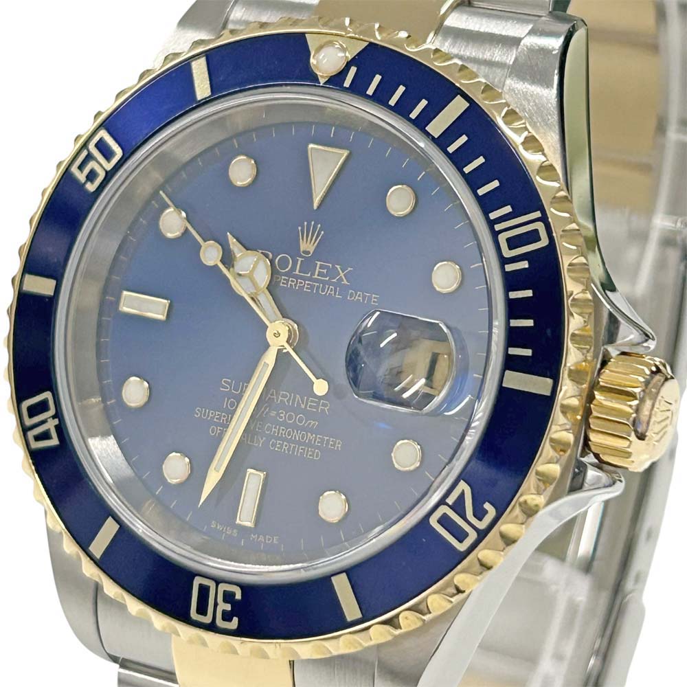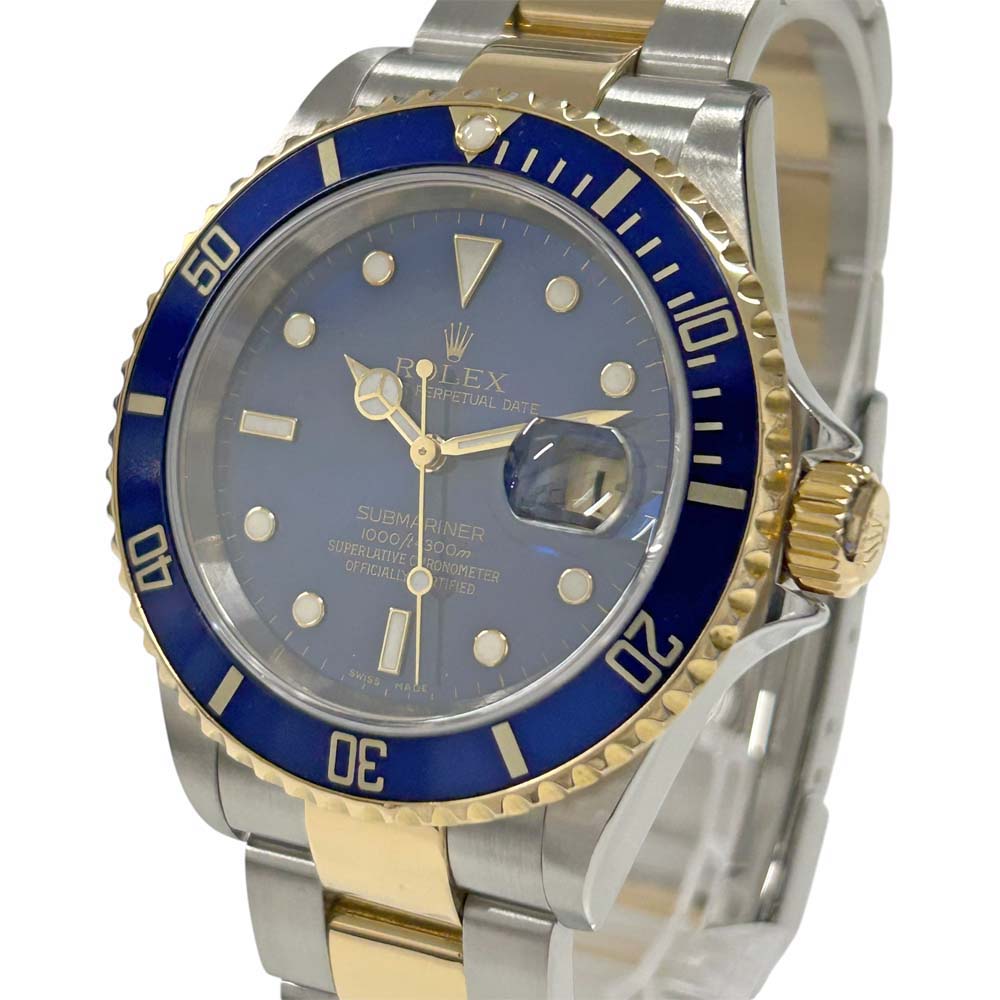 | 商品説明 | ロレックスのサブマリーナデイト16613は、人気のある潜水用腕時計です。特徴的な青や黒のダイヤルとベゼル、ステンレススチールと18Kイエローゴールドのコンビネーションが魅力です。自動巻きムーブメントを採用し、回転式のベゼルは潜水時間の計測に役立ちます。防水性能にも優れており、耐久性が高いことで知られています。