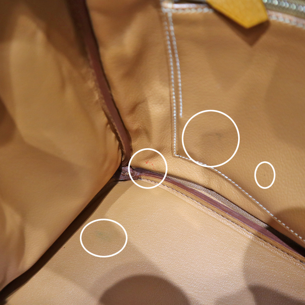 | 商品状態 | ■型崩れ ■ハンドル部分に薄キズ ■金具の小傷、スレ ■角のスレ、黒ずみ ■外側底面と側面一部スレ、キズ ■内側一部汚れ ■店頭でも販売致しますので、画像にない汚れ等付く可能性がありますので予めご了承くださいませ。 |