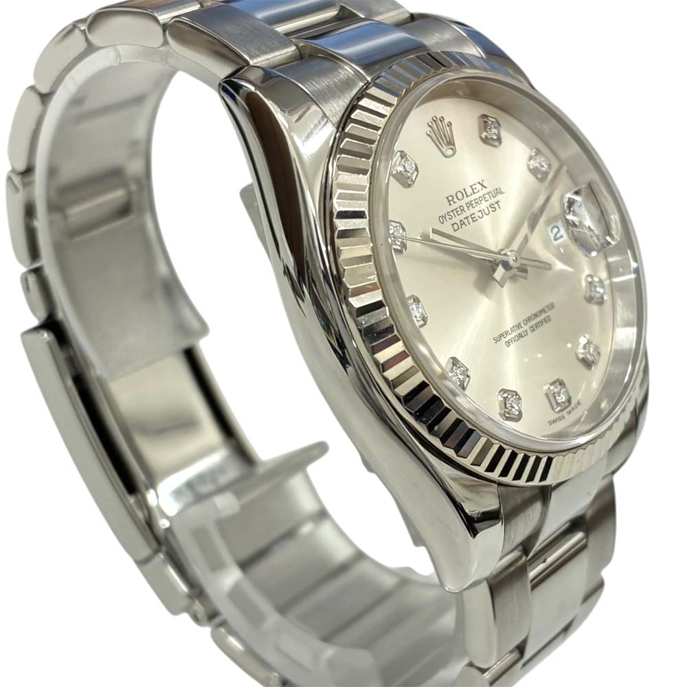 | 商品説明 | ロレックス デイトジャスト36(モデル番号: 116234G)は、エレガントさと機能性を兼ね備えた腕時計です。このモデルは、伝統的な36mmケースサイズで、多くの場面で活躍します。特徴として、フルーテッドベゼルがあり、高級感を演出します。文字盤にはダイヤモンドのインデックスが配置され、視認性と豪華さを兼ね備えています。ブレスレットはジュビリーが使われており、快適な装着感があります。自動巻きムーブメントを搭載しており、精確な時刻を提供します。ステンレススチールとホワイトゴールドのコンビネーションが、この時計のクラシックで洗練された印象を一層引き立てます。
