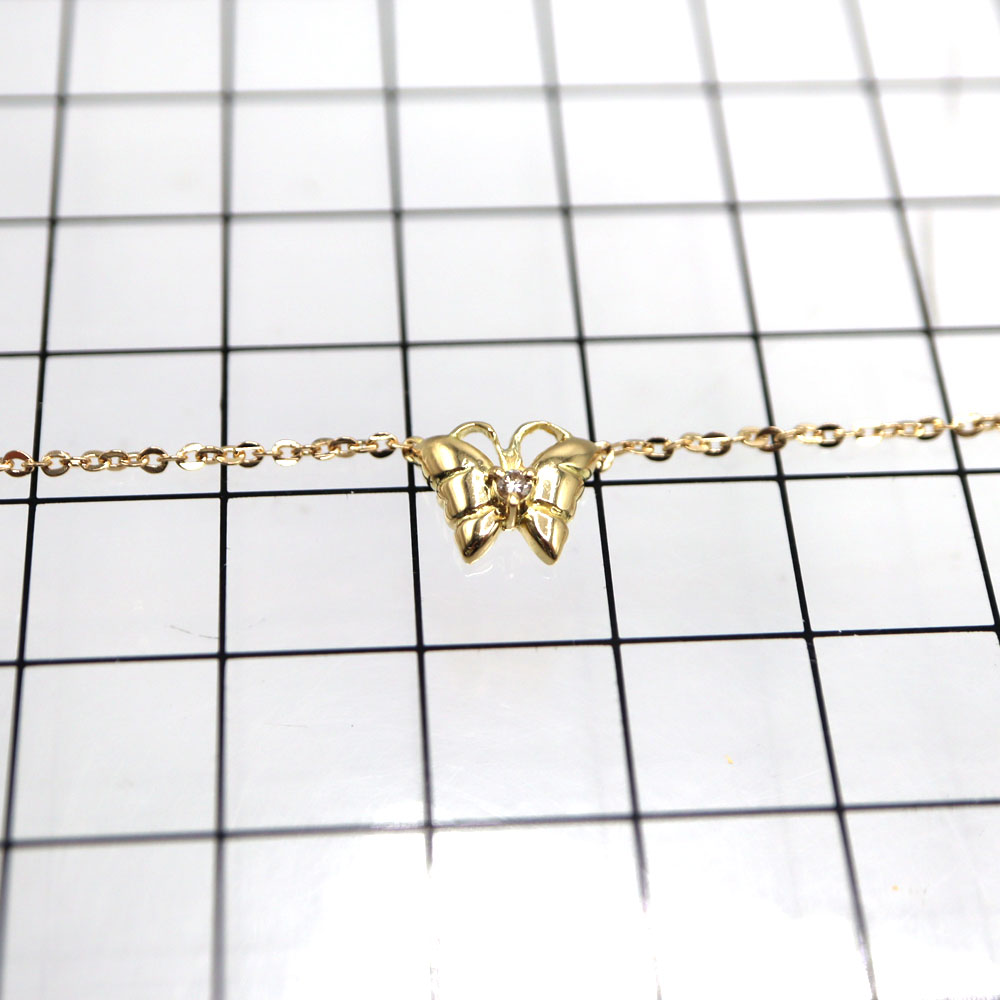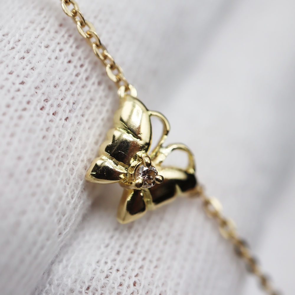中央の蝶には一石ダイヤモンドがあしらわれており、首元で上品な輝きを放ちます。 蝶のアクセサリーは、サナギから成虫へと姿を変える様子から「美しさ・成長・変身・転機」を意味するポジティブなモチーフです。 羽ばたく姿から「飛躍・上昇・幸運」の象徴ともされ、新しい門出のお守りや、女性らしい魅力を引き立てるアイテムとして人気があります。