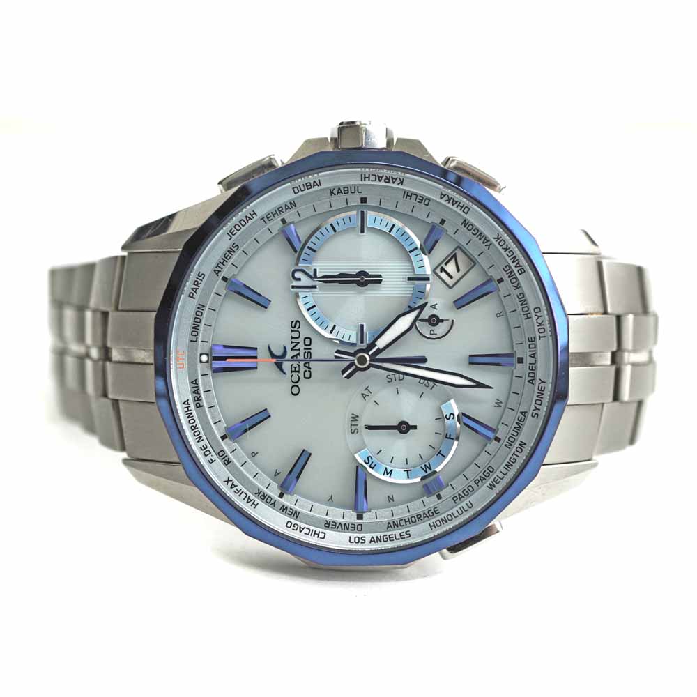 煌く大海原の海面をイメージしたアクアマリンブルーカラーの文字盤が印象的です。 3時側インダイアルのモーターに、運針トルクが高く回転速度の速いデュアルコイルモーターを採用しております。 より短時間でワールドタイム表示が可能になるほか、運針速度に緩急をつけることで独創的な針の動きを表現したデザインが魅力です。 カシオ独自の発電効率に優れた遮光分散型ソーラーセルにより、発色の良い美しい文字盤を実現しています。 この機会に是非いかがでしょうか。