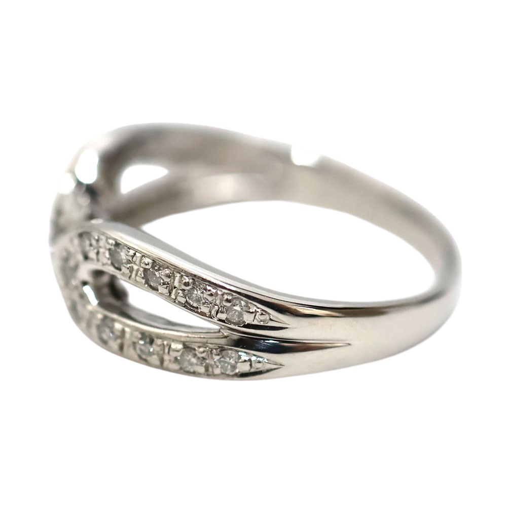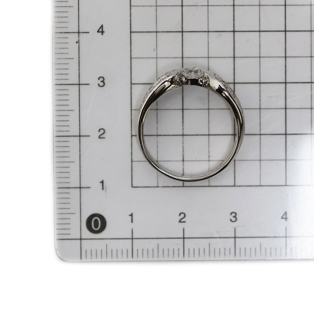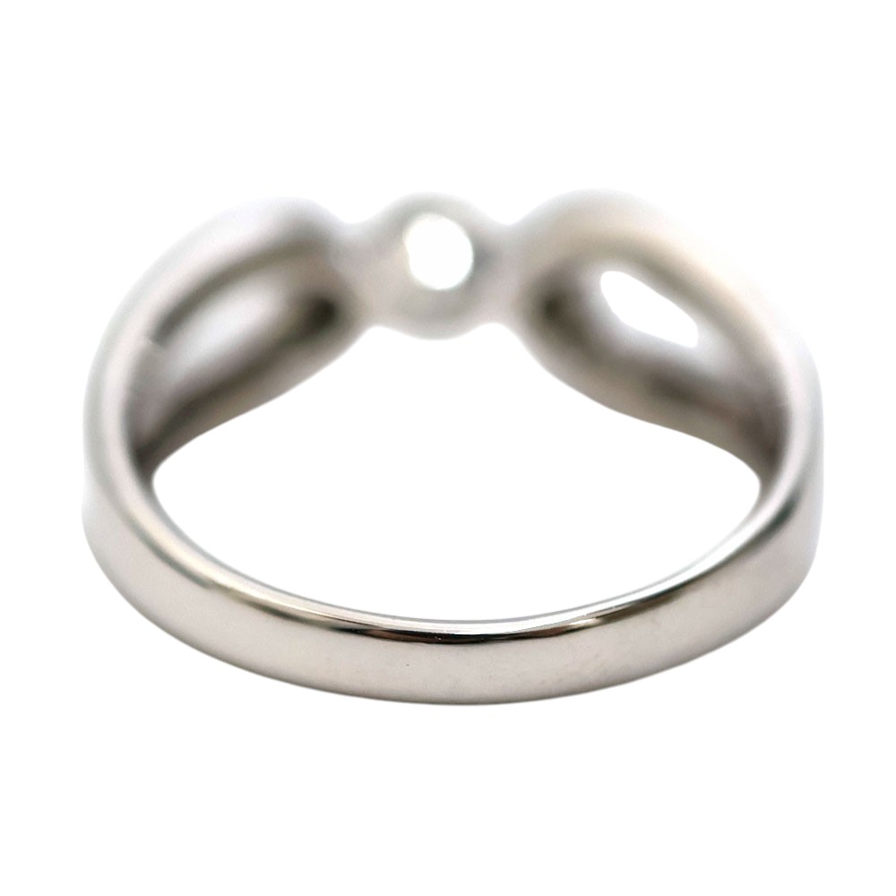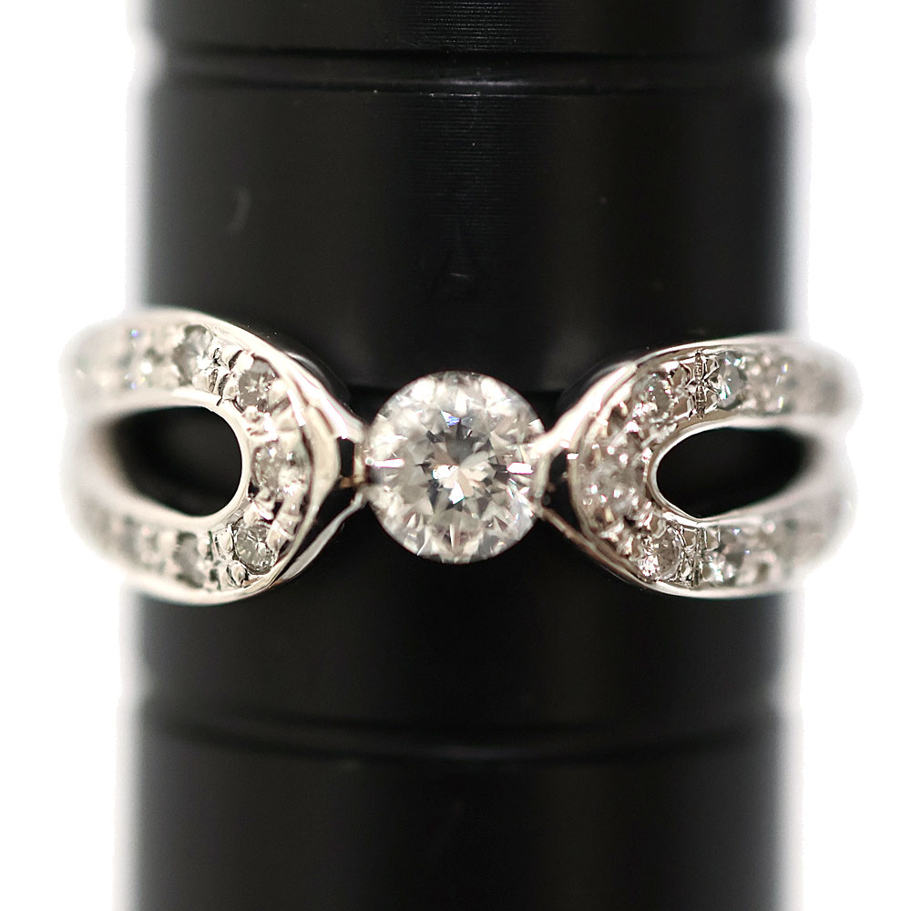 中央には存在感のある一粒ダイヤモンドをセッティングし、両サイドには繊細に小粒のダイヤモンドをあしらった華やかなデザインが魅力です。 流れるようなラインと透かしのディテールが指元に軽やかさと優雅さを演出し、上品で女性らしい印象を与えます。 お探しの方はこの機会にぜひいかがでしょうか。