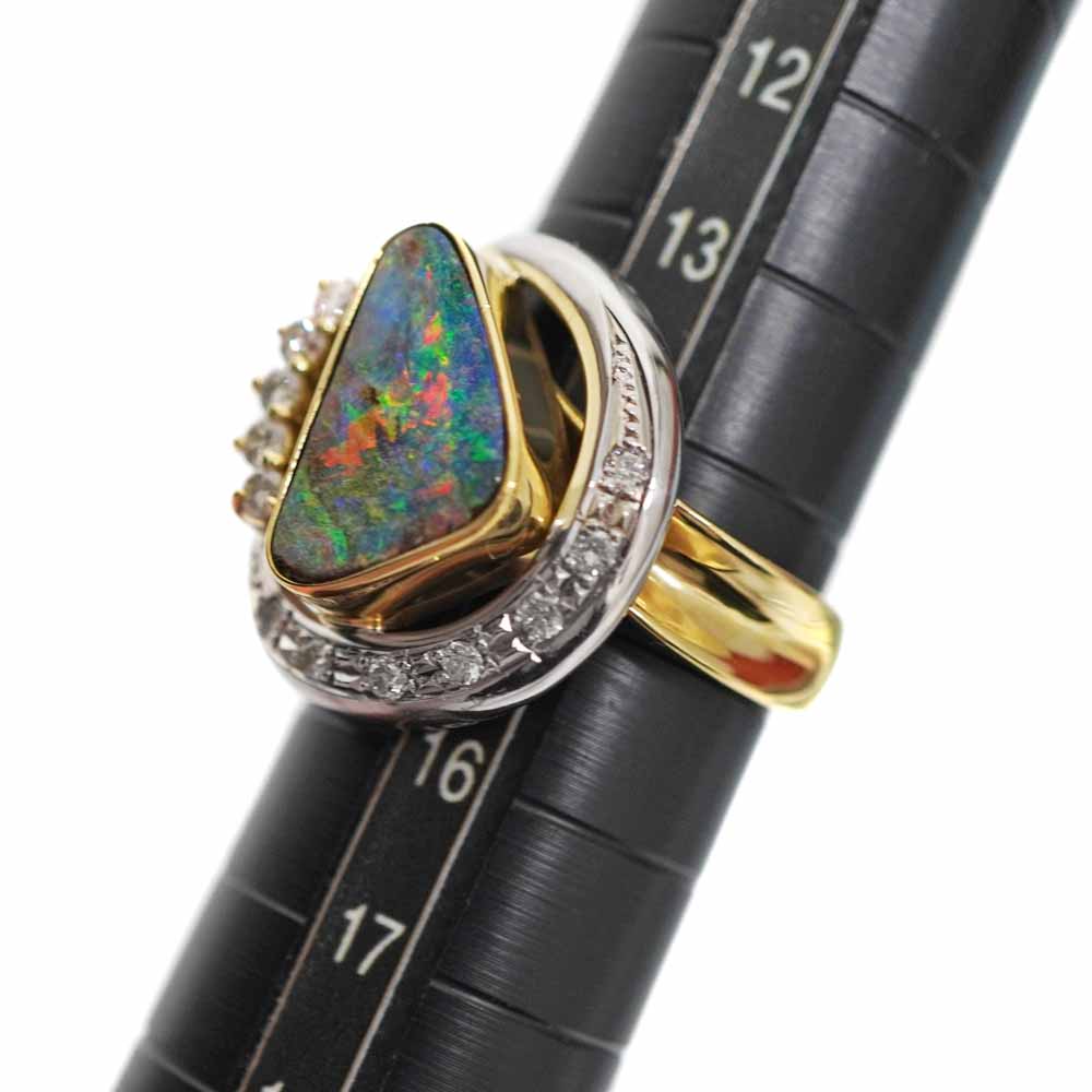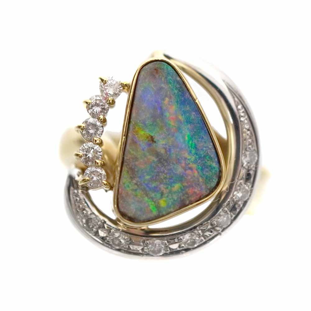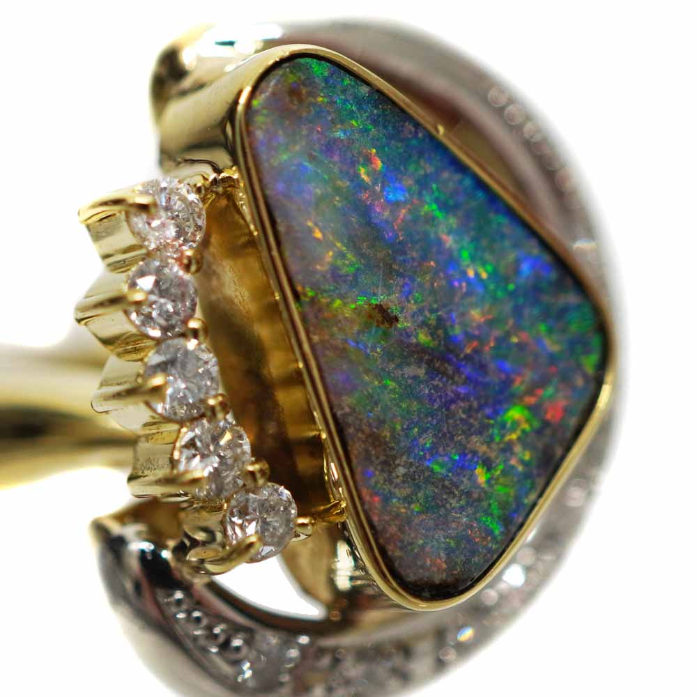 大粒のボルダーオパールと、それを囲むダイヤモンドが美しい華やかなリングです。 存在感があるので、手元をゴージャスに彩ってくれます。