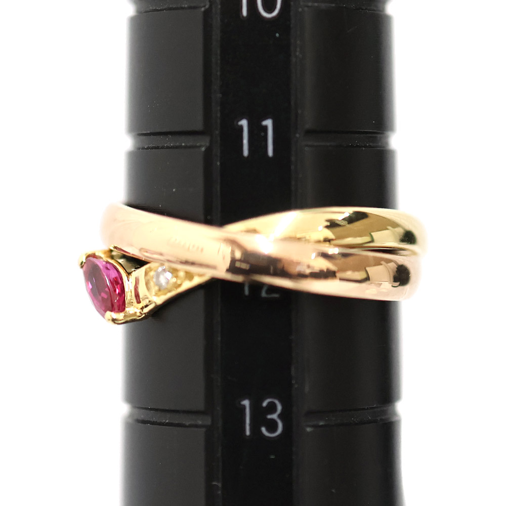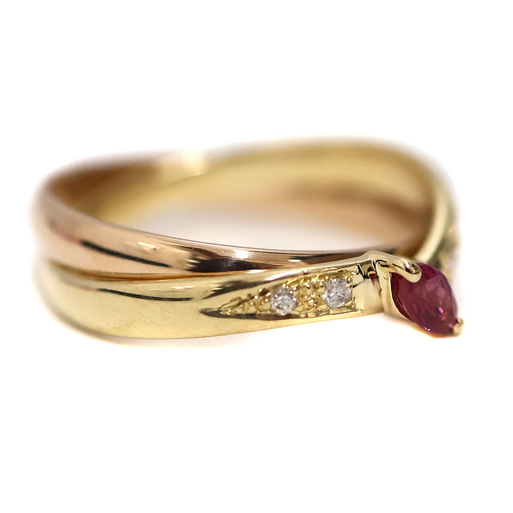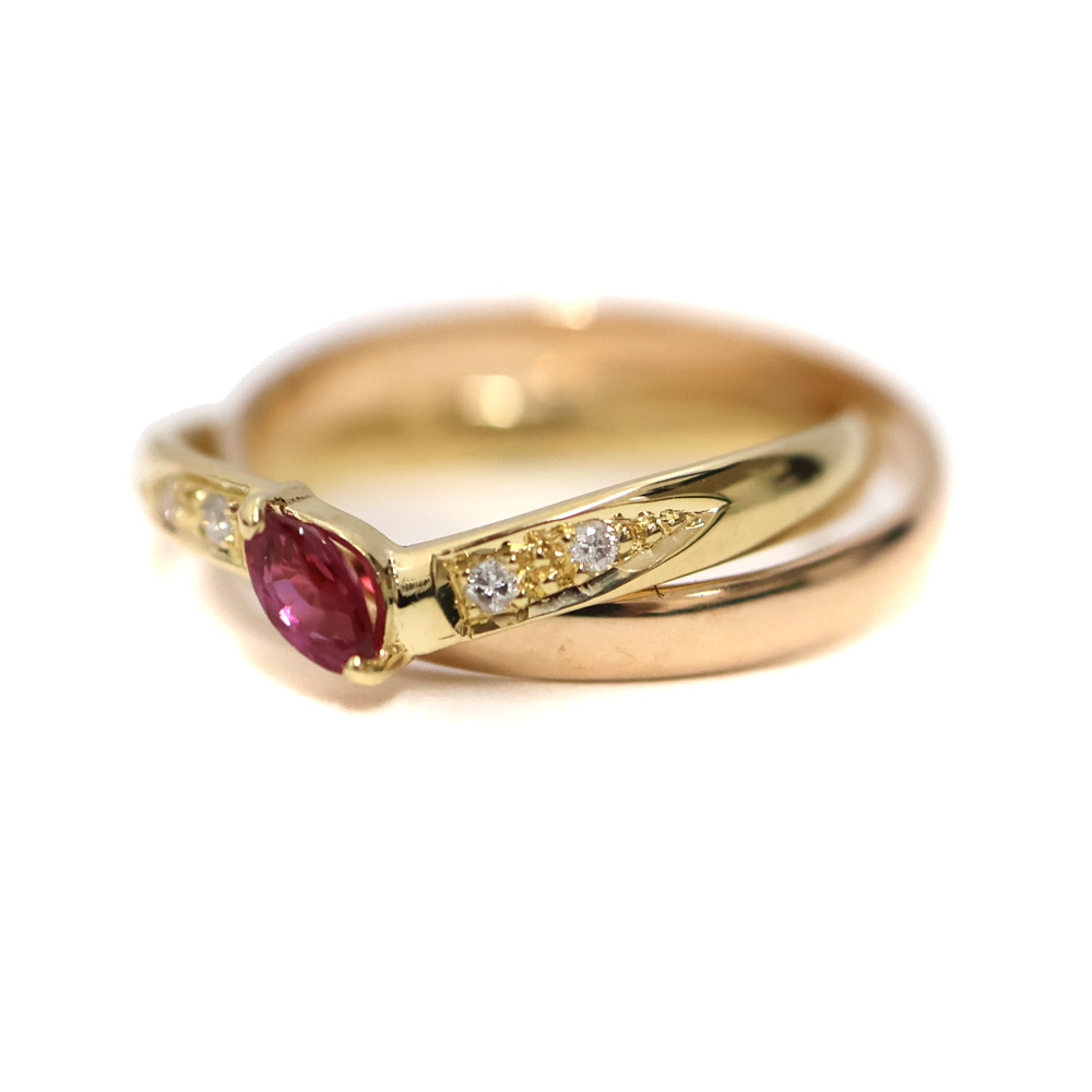 2種類の地金のカラーリングと2連タイプな所が非常にお洒落です。 薄めの色合いのルビーでキツすぎないので普段使いしやすいですよ。 この機会に是非いかがでしょうか。