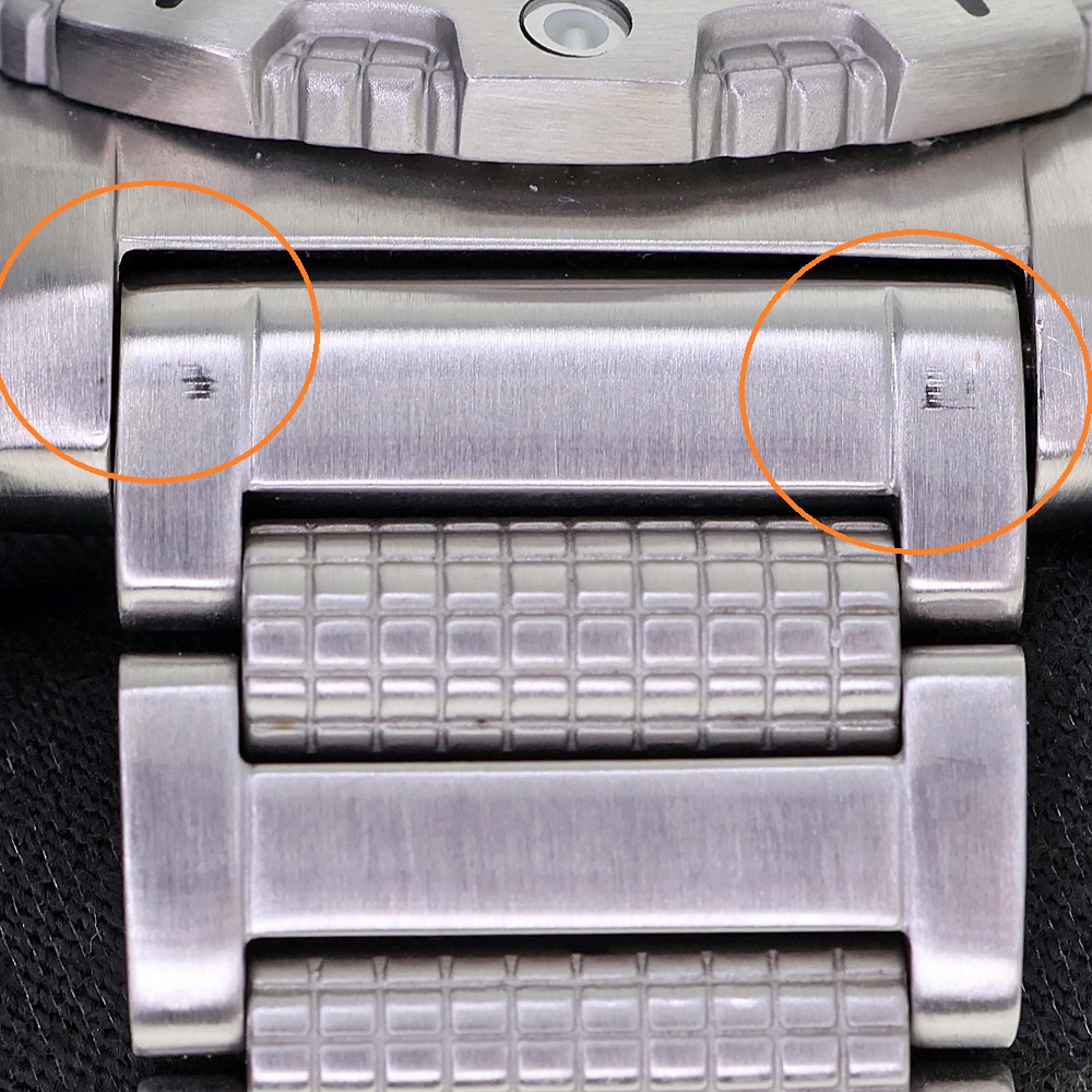 | 商品状態 | ■裏蓋キズ多数あり。 ■ブレス・微調節部分キズ。 ■ベゼルキズ・打痕あり。 ■バックル(留め部分)かなりかたいです。 ■店頭でも販売中のため画像にない傷が付く場合が御座いますのでご了承下さいませ。 |