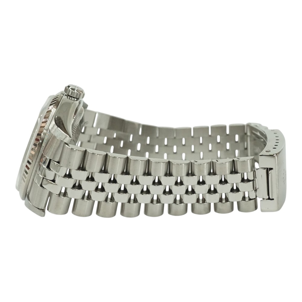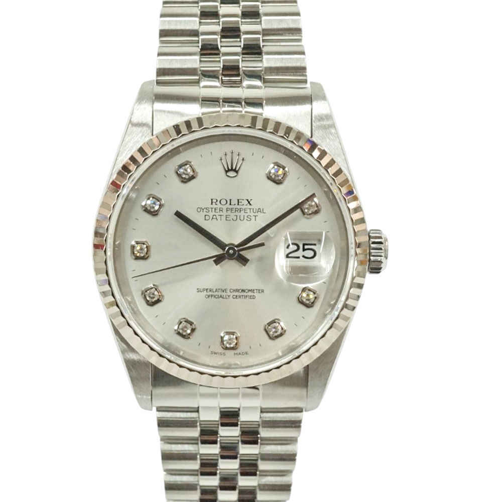 | 素材 | ケース:ステンレス×ホワイトゴール ブレス:SS(ステンレススチール) ベゼル:フルーテッドベゼル ダイヤル:シルバー+10Pダイヤ ガラス:サファイアクリスタル |