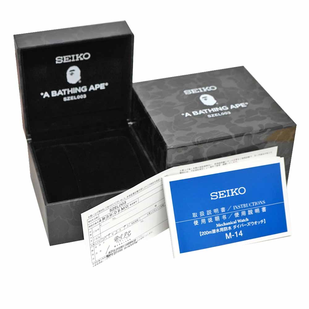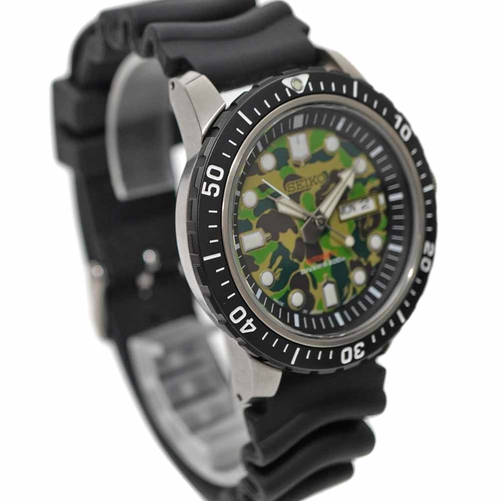 セイコーのメカニカルダイバーズ BAPEコラボが入荷しました。 セイコーとア ベイシング エイプがコラボしたダイバーズウォッチです。 BAPEオリジナルカモフラージュ柄の1ST CAMOをあしらった文字盤と、ダイバーズウォッチならではのポリウレタンバンドという、重厚感のある組み合わせのデザインが特徴的です。 また200m防水機能や日付、曜日表示機能等、日常使いにぴったりな機能を兼ね備えているモデルとなっております。 お探しの方はこの機会にぜひいかがでしょうか。