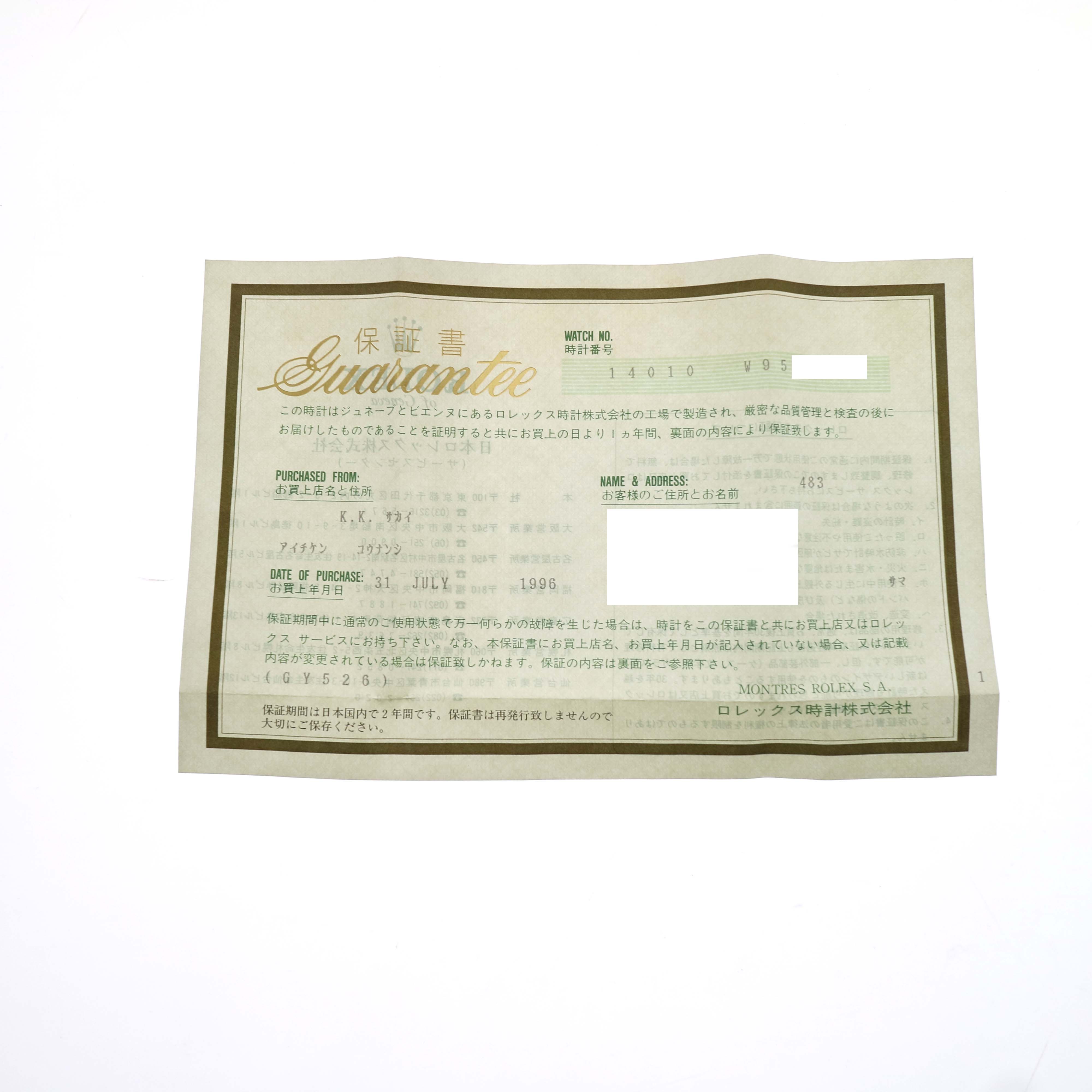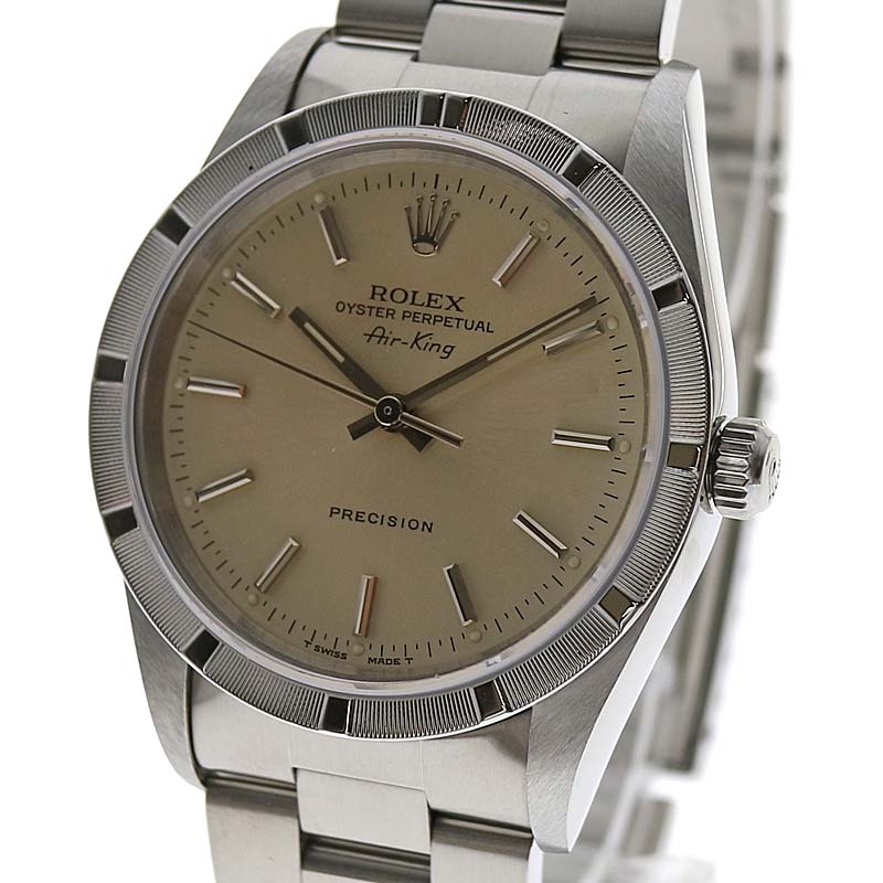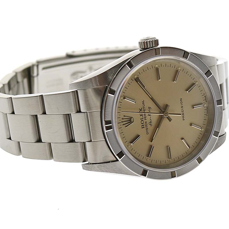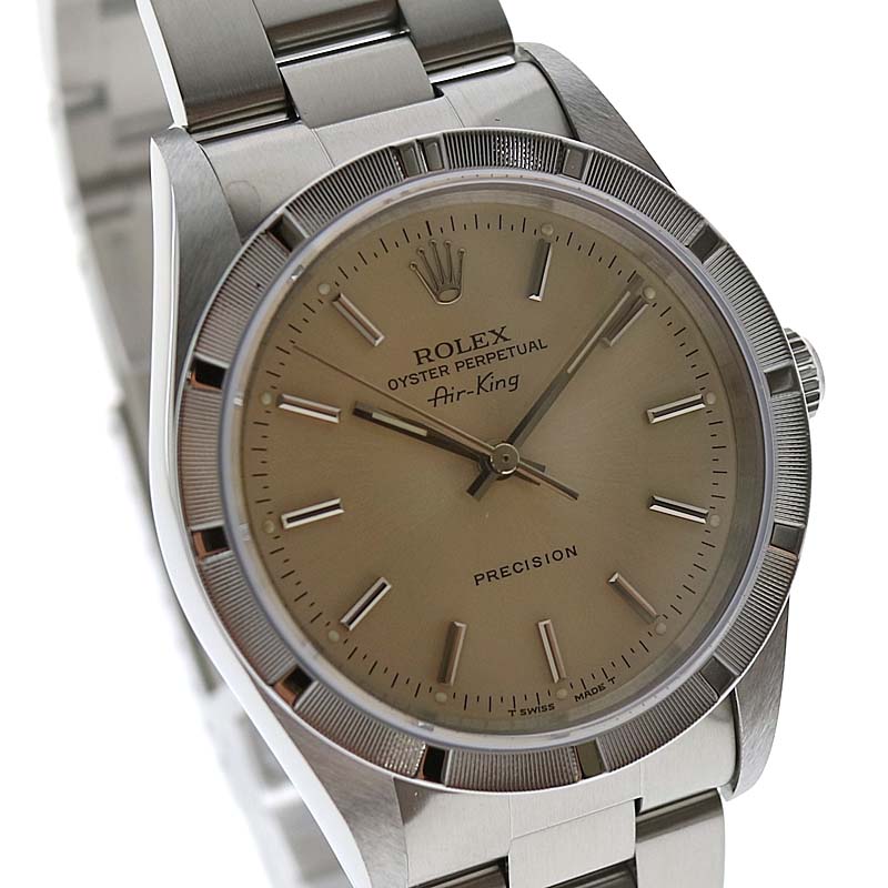 商品説明 | ロレックス 14010 エアキング のご紹介です。 ロレックスの中でも人気の高いモデル、エアキングです。 定番のエアキングのスムースベゼルとは異なり、エンジンターンドベゼルを搭載したモデルです。 文字盤は少し茶色味があるシルバー系になります。 ※メーカー保証書には【1996年7月】に購入された記載があります。購入者氏名や住所部分はべた塗りで消させて頂いております。 ※販売に伴い弊社提携業者にて【新品仕上げ】【オーバーホール】を行っておりますが、研磨で取り切れない小傷がある場合がございます。 |