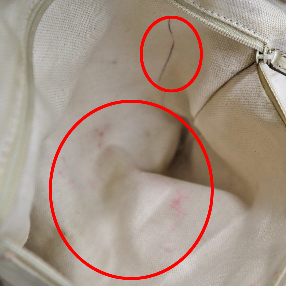 ■型崩れがあります。 ■金具に小傷・メッキ剥げがあります。 ■ハンドルにスレ、擦れによる塗装ハゲ(変色)があります。 ■表面のキャンバス地部分に汚れ・多少の破れ箇所があります。 ■表面のレザー部分にキズ・スレがあります。 ■ショルダーストラップにコバ取れがあります。 ■内張り、内側ポケット内部にシミやペン跡等の汚れが複数個所見受けられます。 |